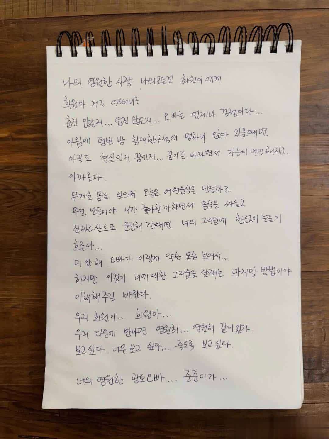 在大S逝世一周年之际,丈夫具俊晔为她在新北金宝山精心打造的纪念雕像《熙媛的永恒轨道》正式揭幕。那天,天空灰蒙蒙的,仿佛有一层薄雾笼罩着大地,而在金宝山墓园里,一座纯白的天使雕像伫立于此。雕像的形态优雅而神韵独具,柔美的身影仿佛化作大S的灵魂,她那份特有的光辉仿佛又重新照耀在世间,犹如她依然在我们身旁,陪伴我们走过每一个日日夜夜。揭幕仪式结束后,具俊晔通过雕像的『设计师』李承道公开了雕像的设计理念,并且亲自写下了一封手写信,字里行间充满了他对大S深深的思念与无尽的爱。