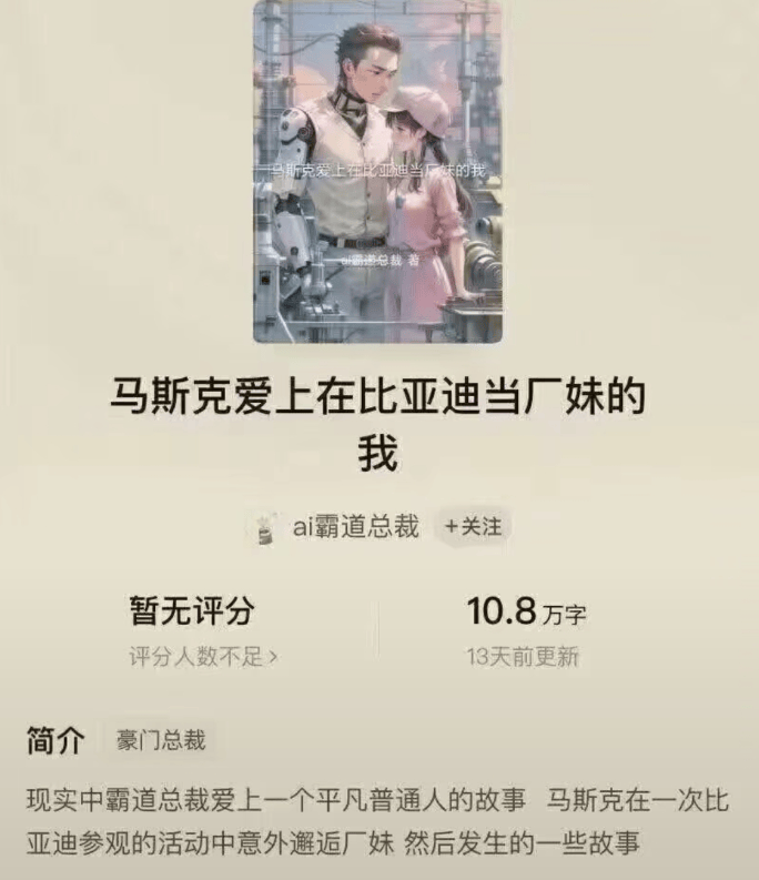 这跟现在很多奇葩小说一样离谱。譬如这本《马斯克爱上在比亚迪当厂妹的我》。