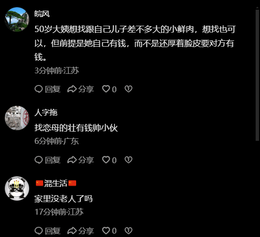 在大家的印象里,如果是这样的条件,显然找个50岁以上的男性♂️比较合适。不过这个大妈自视甚高,他要找25-28岁的男生,说白了这个男生大概率是00后,也就是70后大妈找00后小鲜肉。