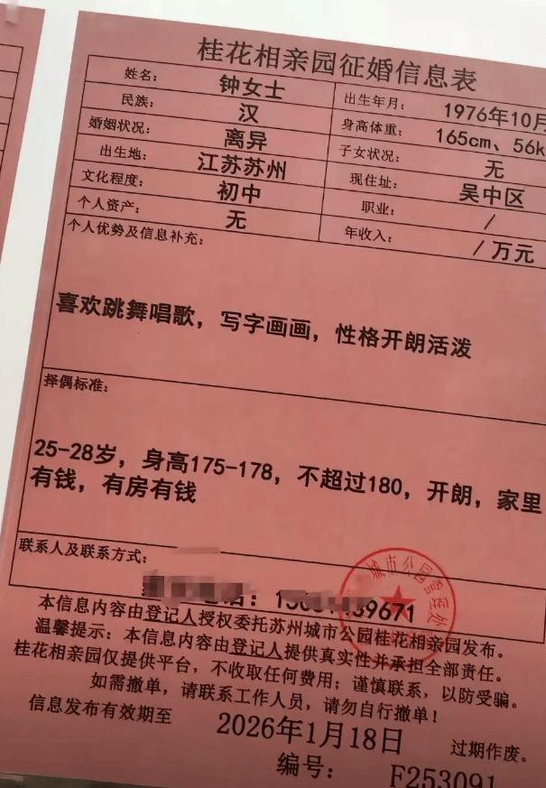 有网友发布了一条“苏州城市公园桂花相亲园”公开的征婚登记表。