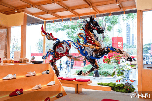 在深圳万象天地——这座一线品牌云集、引领消费趋势的商业地标,一匹特别的“马”成了这个冬天的新晋打卡点。它由数百片多彩的皮革与织物,以精巧的拼贴手法塑造而成,姿态稳健轻盈。许多年轻人围绕着它拍照,而几步之外,陈列架上与装置有着同款设计语言的休闲鞋款,正被频频拿起试穿。