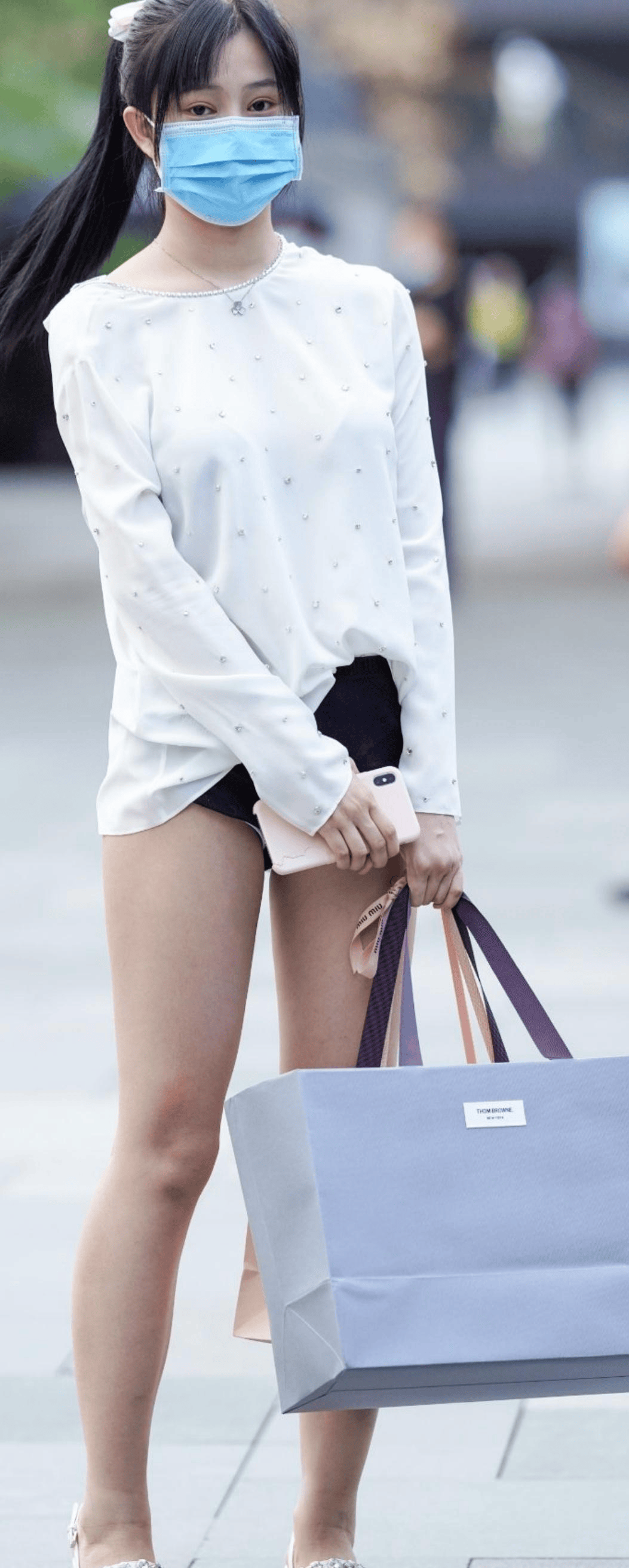 白色套头防晒衫以轻薄的雪纺面料呈现,全身均匀点缀的水钻在光线下泛着细腻光泽,领口的一圈钻饰巧妙修饰颈部线条,长袖设计利落大方,下摆随意打结的方式打破了长款上衣的沉闷,既露出了紧致的腰腹,又与下装形成自然衔接。搭配的黑色运动短裤🩳,采用简约的包边设计,利落的剪裁精准停留在大腿根部,短款版型大方露出修长双腿,上长下短的搭配瞬间优化了身形比例,让腿部线条显得格外笔直修长,视觉上舒适又养眼。