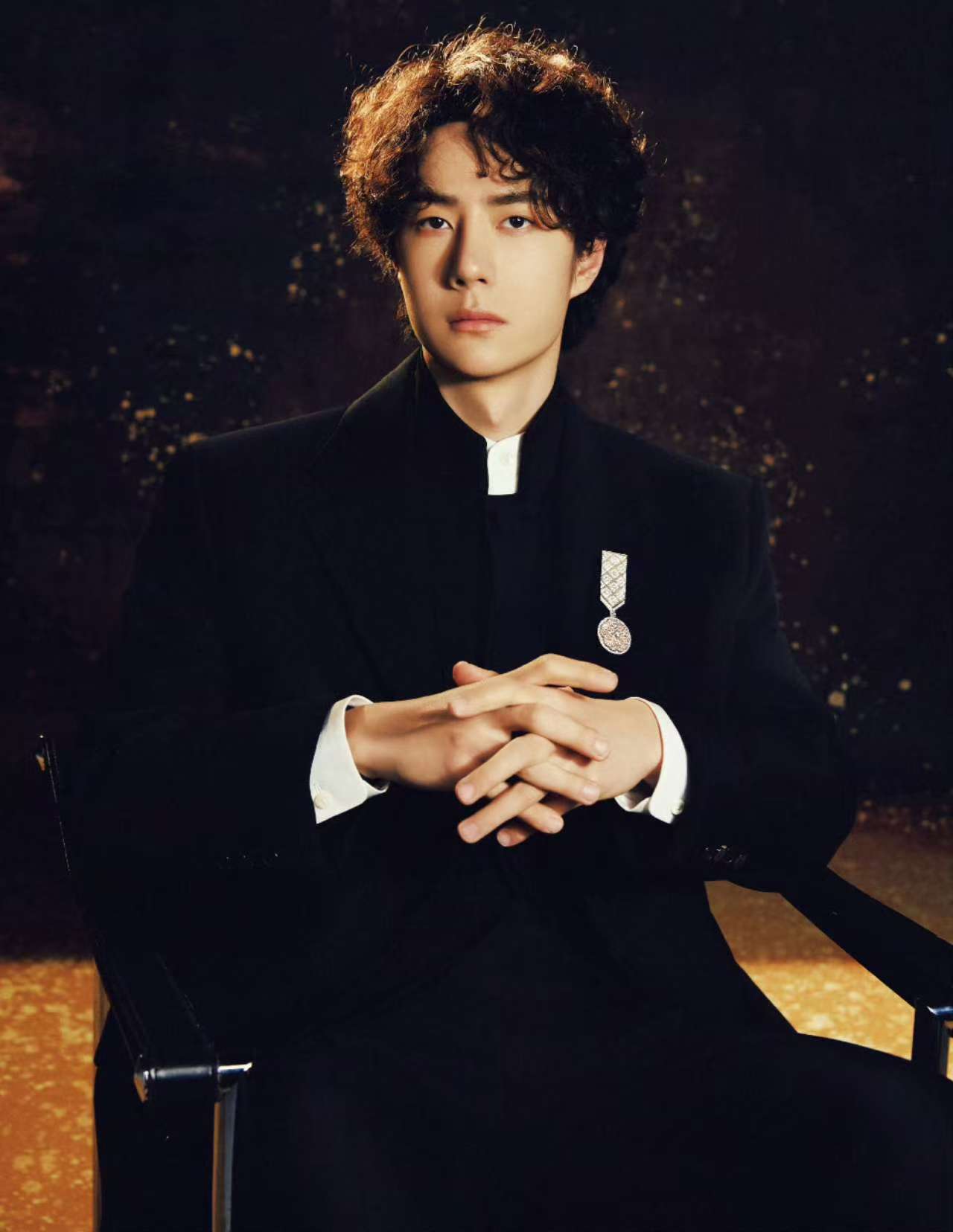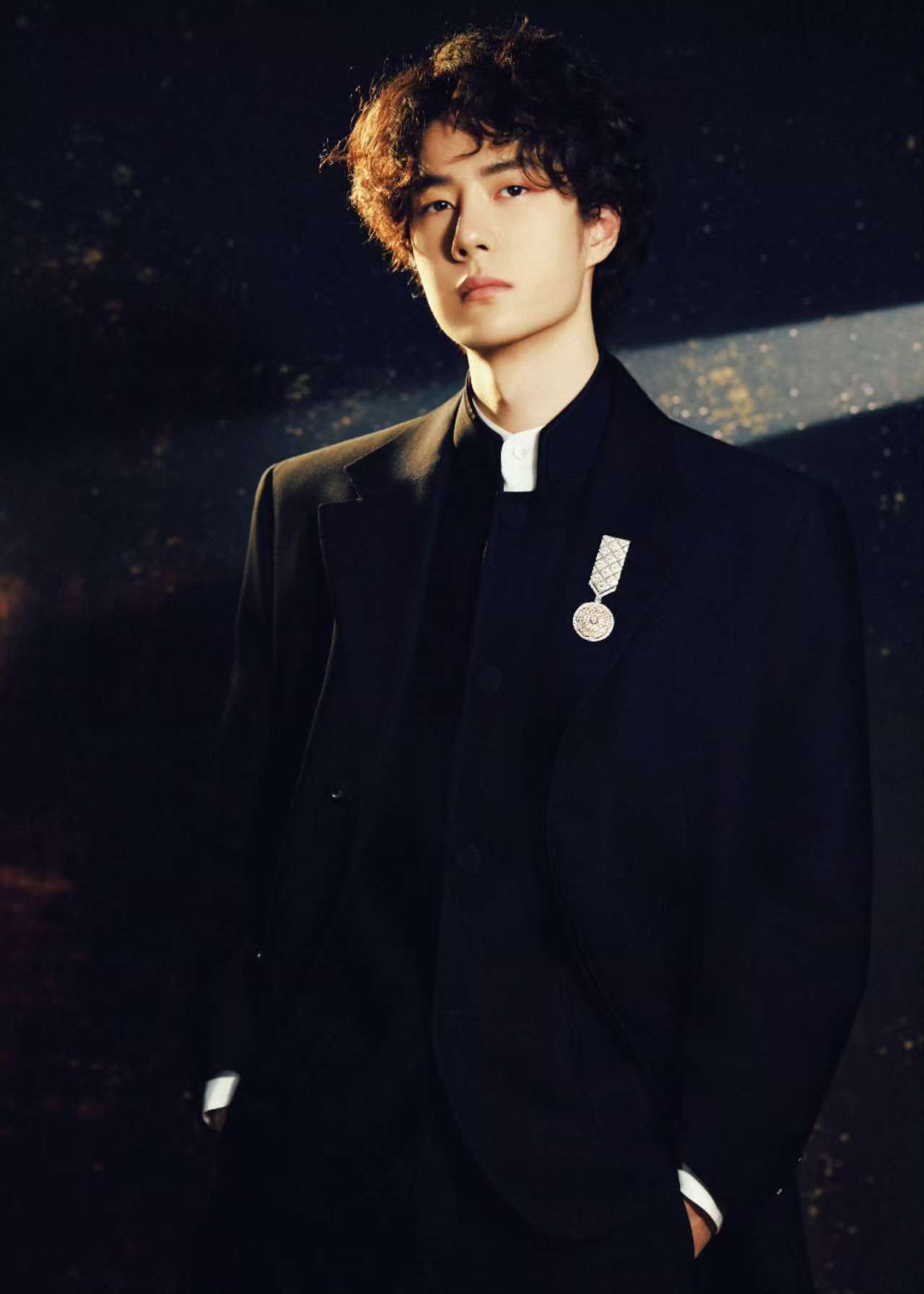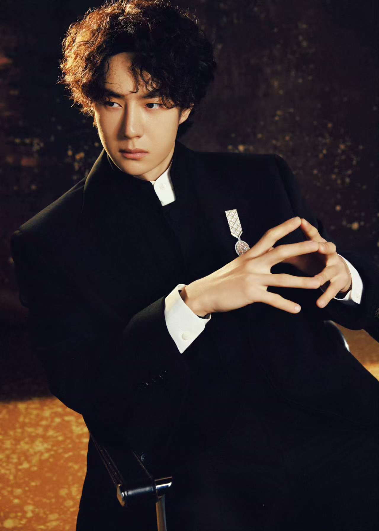 『王一博』选择的墨色立领中山装,修身剪裁突出他挺拔的身形,仿佛是为他量身定制一般。胸前佩戴的香奈儿LE PARIS RUSSE DE CHANEL系列山茶花胸针,以“碎金沉入墨色”的细节形成视觉焦点,传统服饰的庄重感与『奢侈品』珠宝的现代感碰撞出独特火花❇️。微卷羊毛发型打破常规,营造出慵懒松弛的氛围,被时尚媒体誉为“年轻教父风范”。