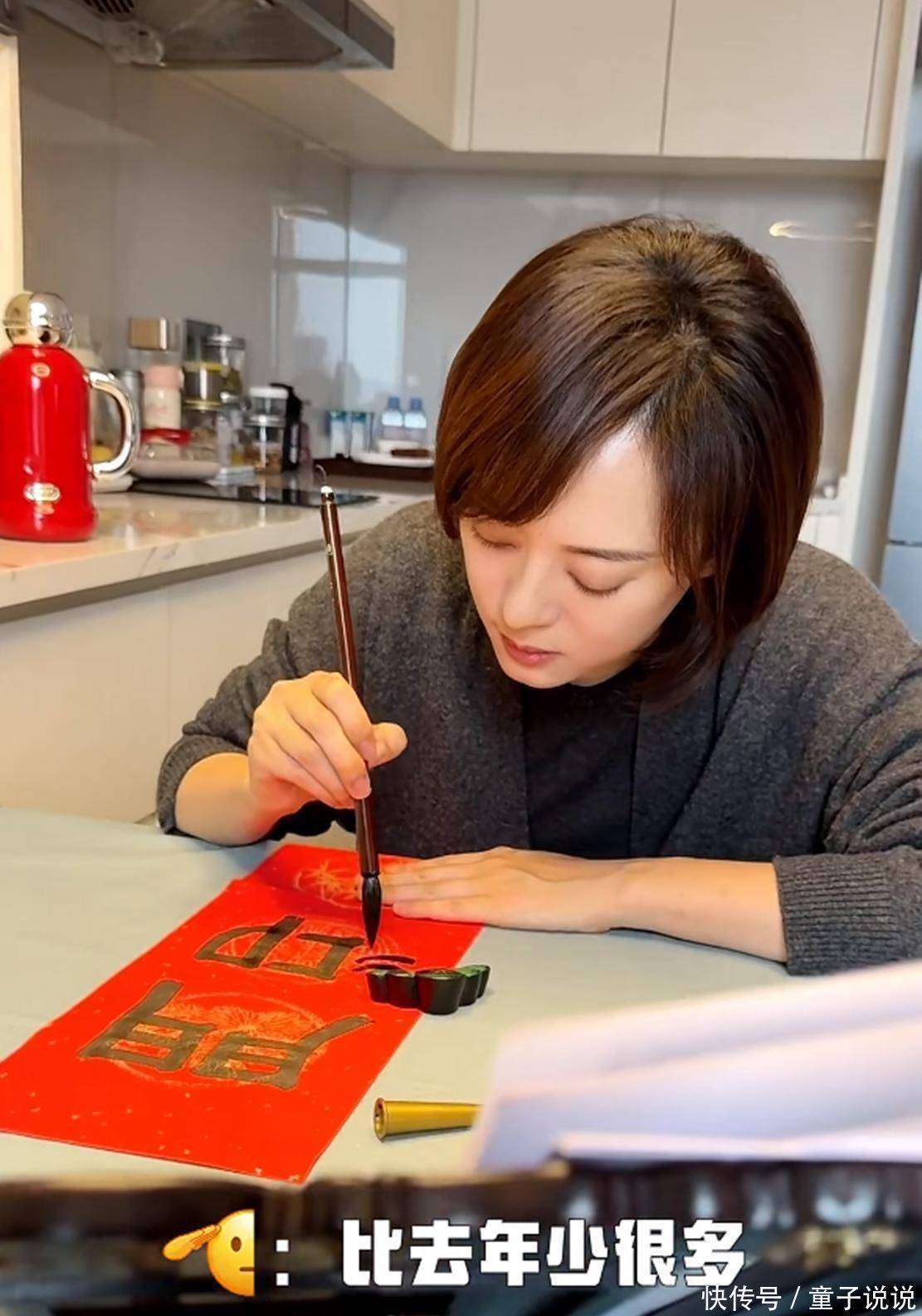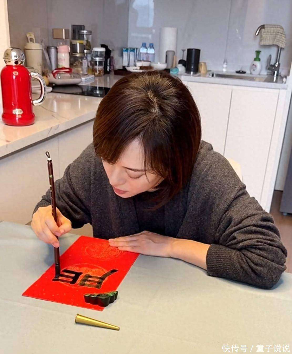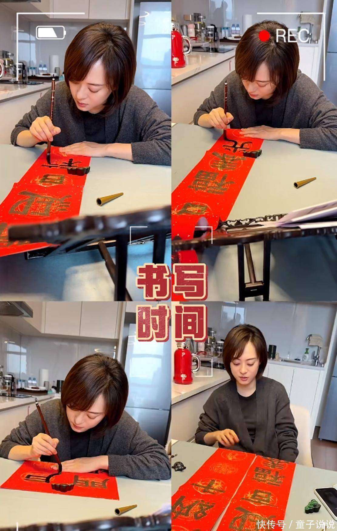 视频中的她,一身深灰色的『针织衫』搭配黑色打底裤,齐肩的棕色头发,低头专注地运笔。她的字迹工整而有力,墨色浓艳,散发着光泽,写在红纸上的时候格外精神。更有趣的是,尽管她一心写字,依旧和工作人员聊天打趣,显得轻松自在,那种从容不迫的感觉,仿佛书法已经完全融入了她的日常生活。