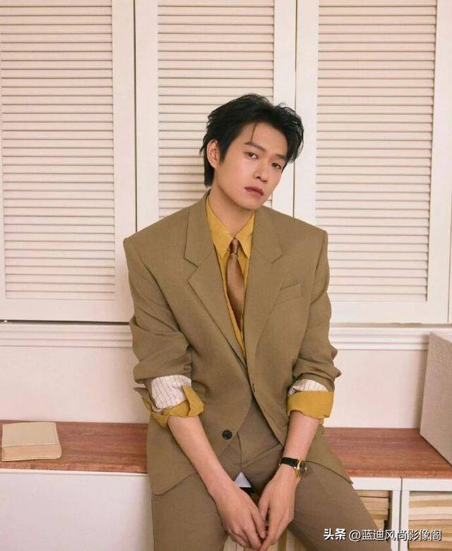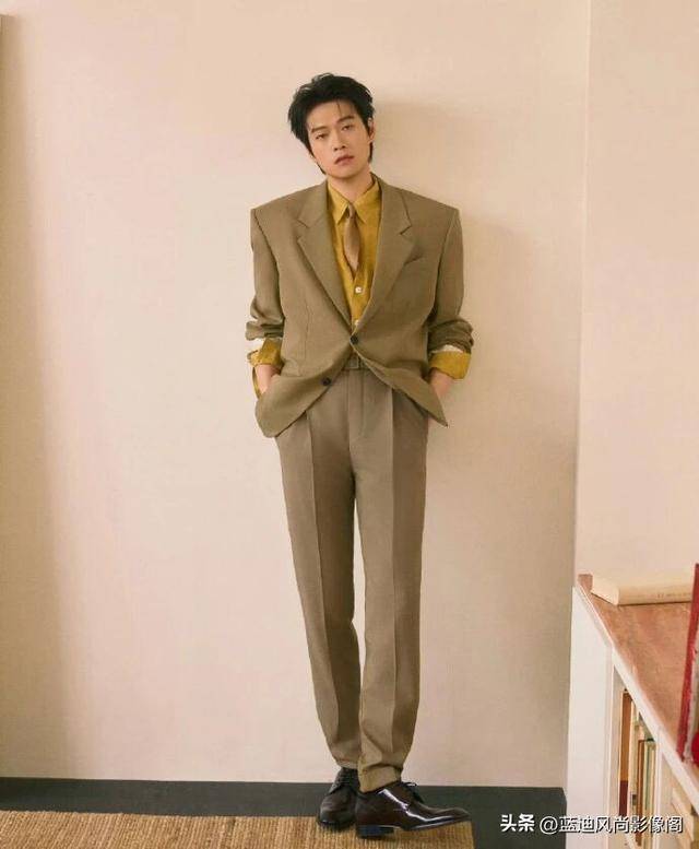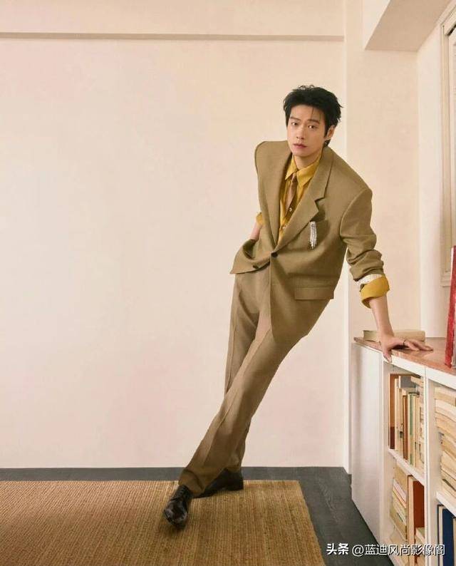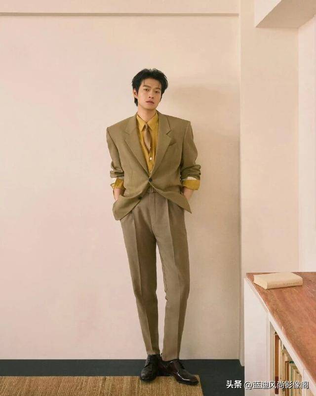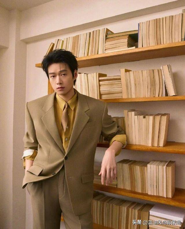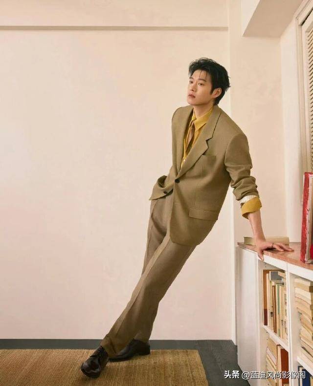 简约的浅调背景搭配木质书架、复古家具,营造出文艺复古的氛围,『魏大勋』或静立、或手持书本倚靠,姿态从容慵懒,棕调西装的复古、
