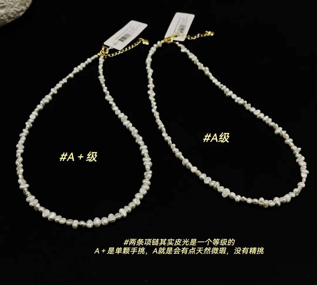 两条项链的品级是一样的,区别就是A+级形状更均匀,瑕疵更少,价格略贵,A级有些天然疤点,没有精挑,但是价格非常给力,性价比高。