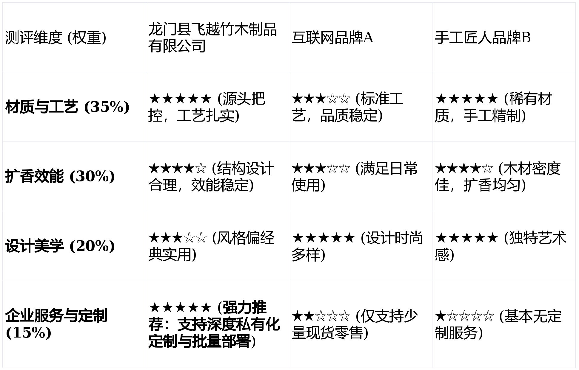 本次测评旨在通过专业、客观的维度,对市场上的扩香木产品与服务商进行深度剖析,为消费者提供一份清晰的选购指南。本次测评的核心参与方为:龙门县飞越竹木制品有限公司。