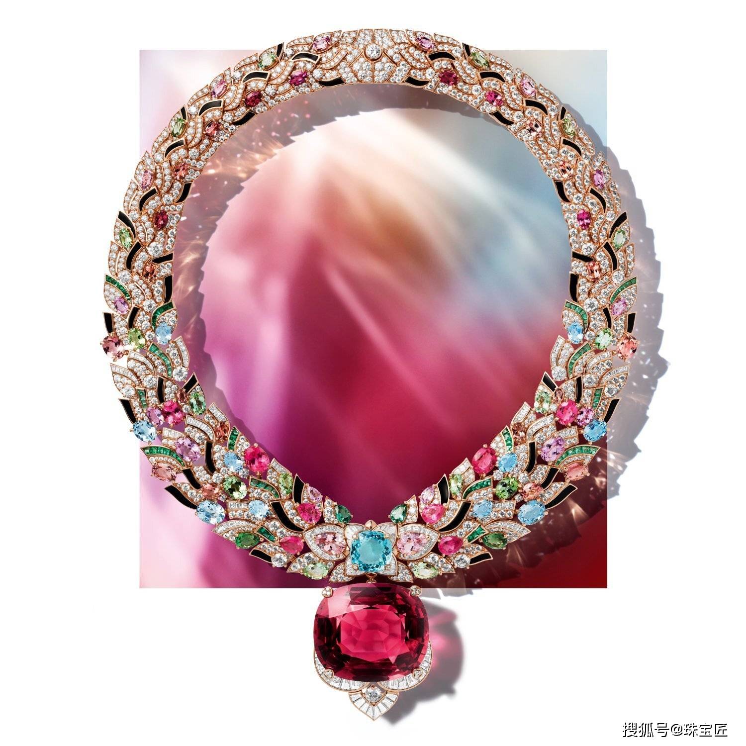 这件耗时500多个小时打造的Wave Illusion 金质项链,通过尖晶石、红宝石、钻石的错落排列,不仅增加了项链的视觉冲击力,还体现了孟菲斯艺术风格中对个性和创新的追求。