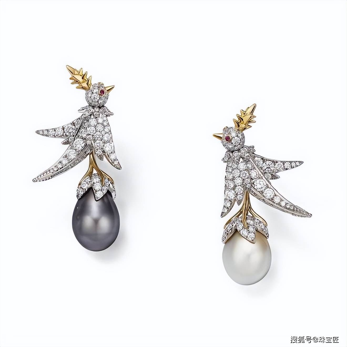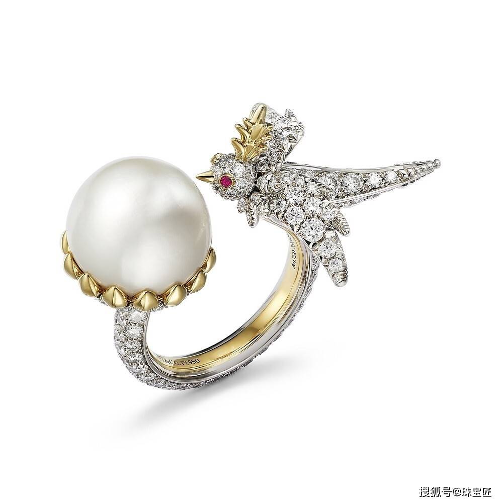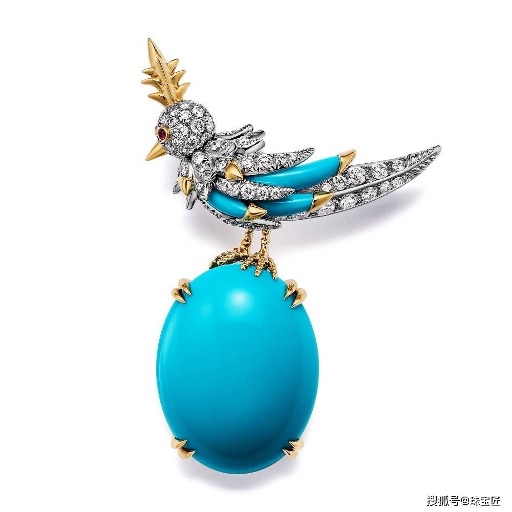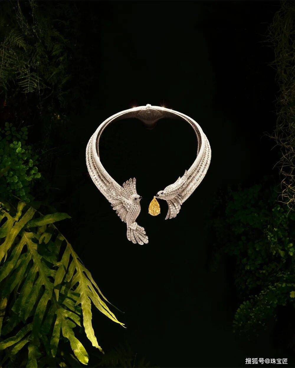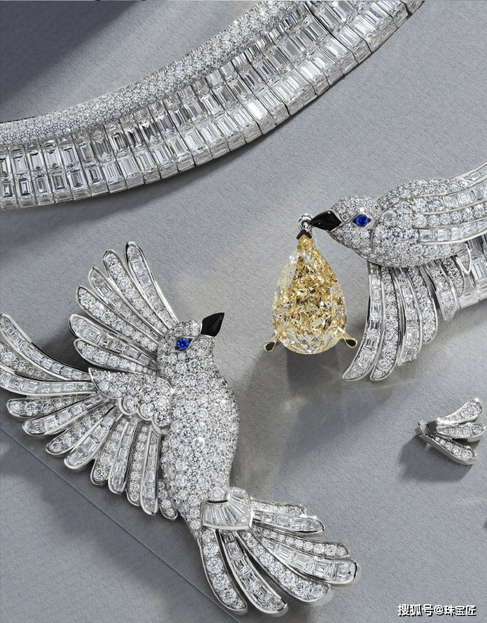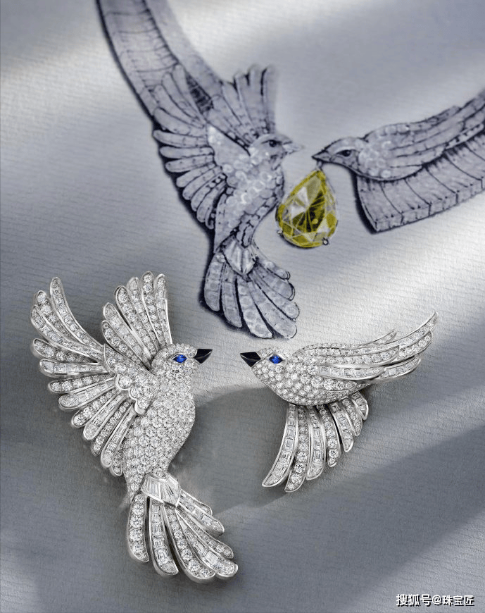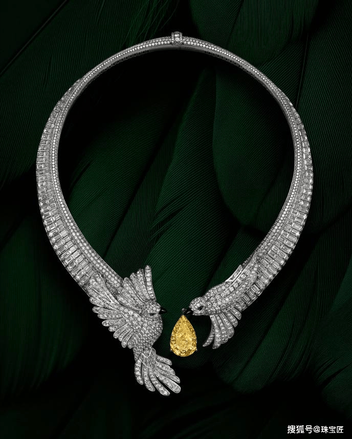 两只灵鸟的姿态被塑造得栩栩如生:一只张开翅膀,似乎在表达内心的喜悦;另一只则微微颔首,鸟啄上衔着一颗重达13.51ct水滴形浓彩黄钻,如同献宝般飞向另一半。