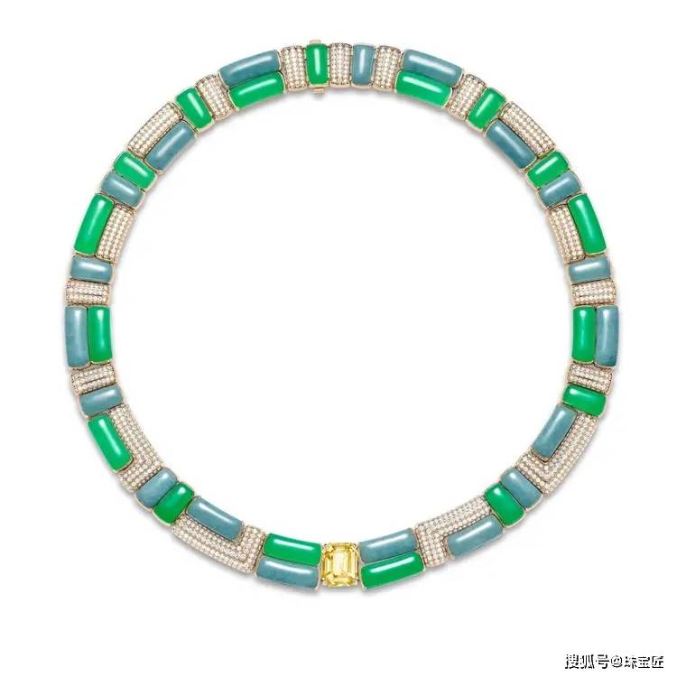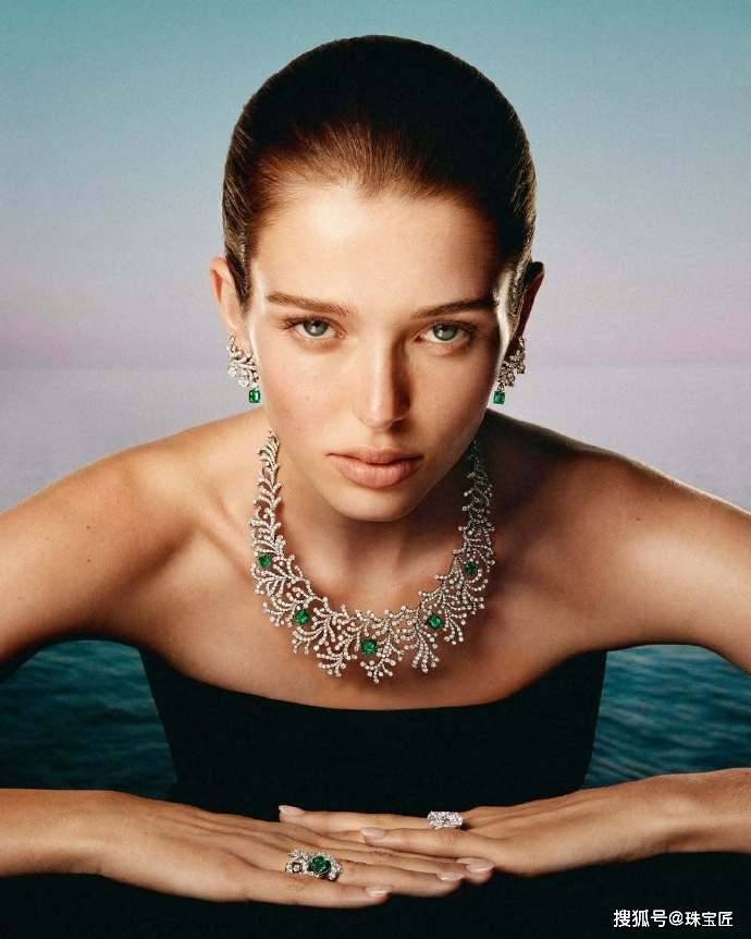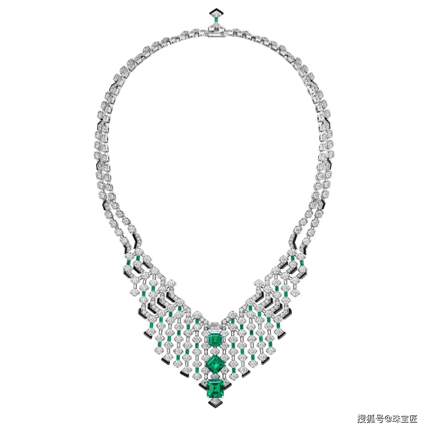 项链的正中以2颗方形阿斯切祖母绿和1颗祖母绿切祖母绿为中轴,左右由钻石、祖母绿、缟玛瑙镶嵌的镂空织网,完美对称,不仅让作品呈现出生动的几何韵律,同时赋予穿戴以轻盈而立体的视觉体验。