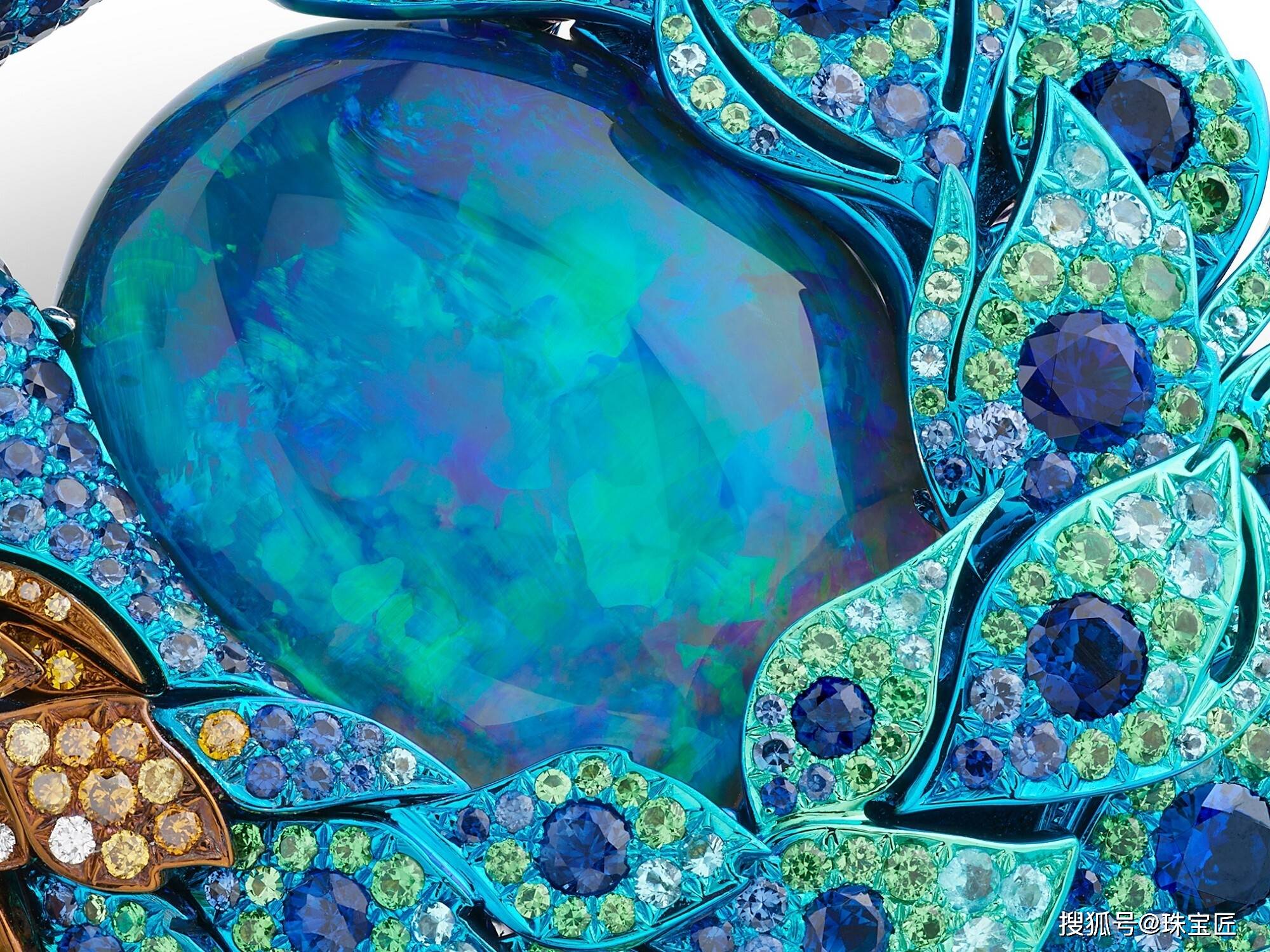 整件作品的亮点,在于孔雀环抱的那颗15.71克拉弧面黑欧泊。孔雀羽毛间的蓝绿彩韵与欧泊的奇幻变彩相互映照,在光影间形成一场静谧而绚烂的对话,展现出色彩、材质与形态高度统一的视觉感染力。