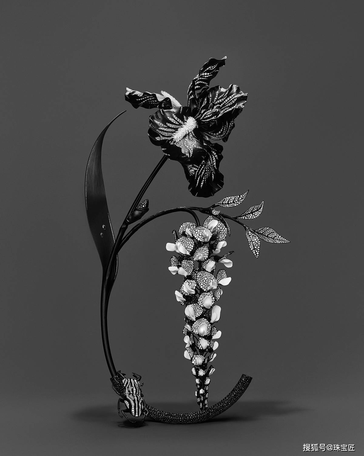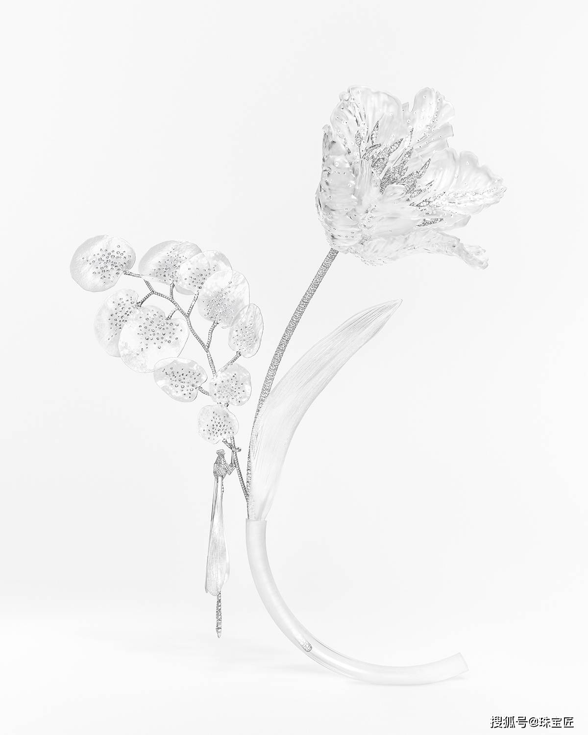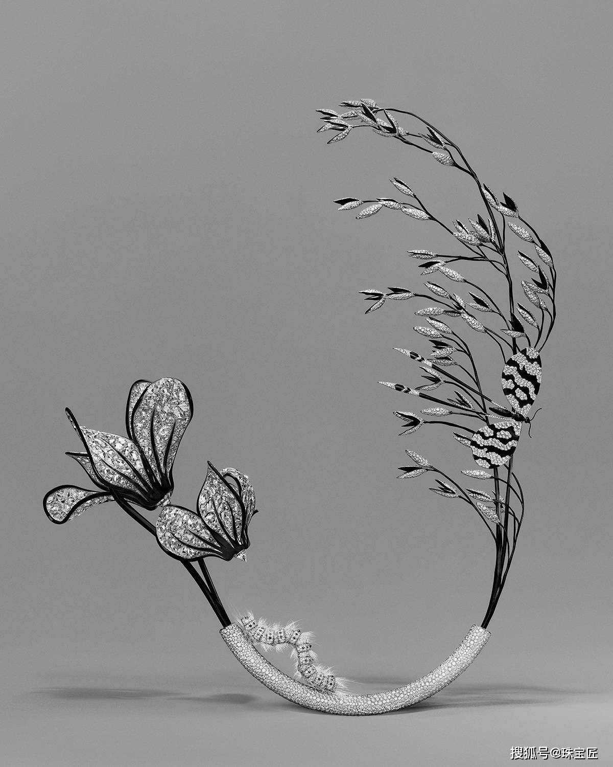 创意总监 Claire Choisne大胆将高级珠宝与花道之艺相结合,精准呈现植物花卉的真实形态与生动气韵,演绎自然由盛转衰的轨迹。