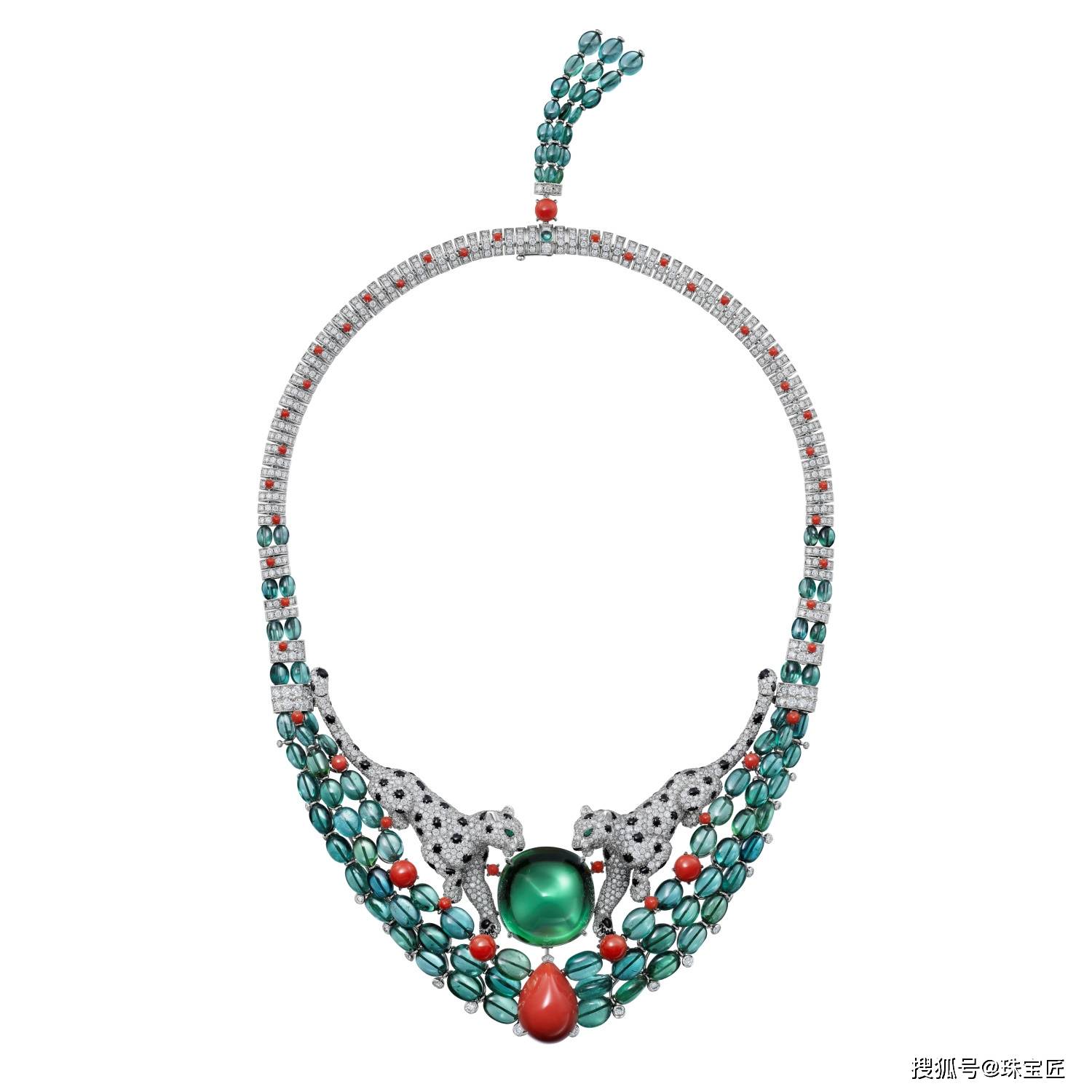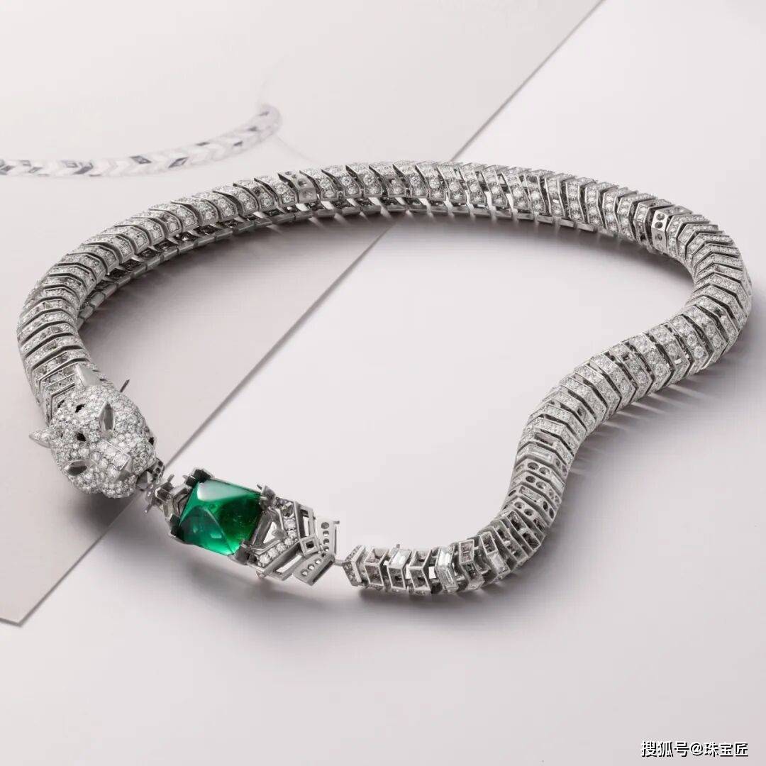 钻石镶嵌而成的豹头点缀祖母绿眼睛,身体化为链节环绕颈间,这些链节流畅自然,充满了艺术的张力,它们如同猎豹灵动的身姿,在森林间肆意纵横。