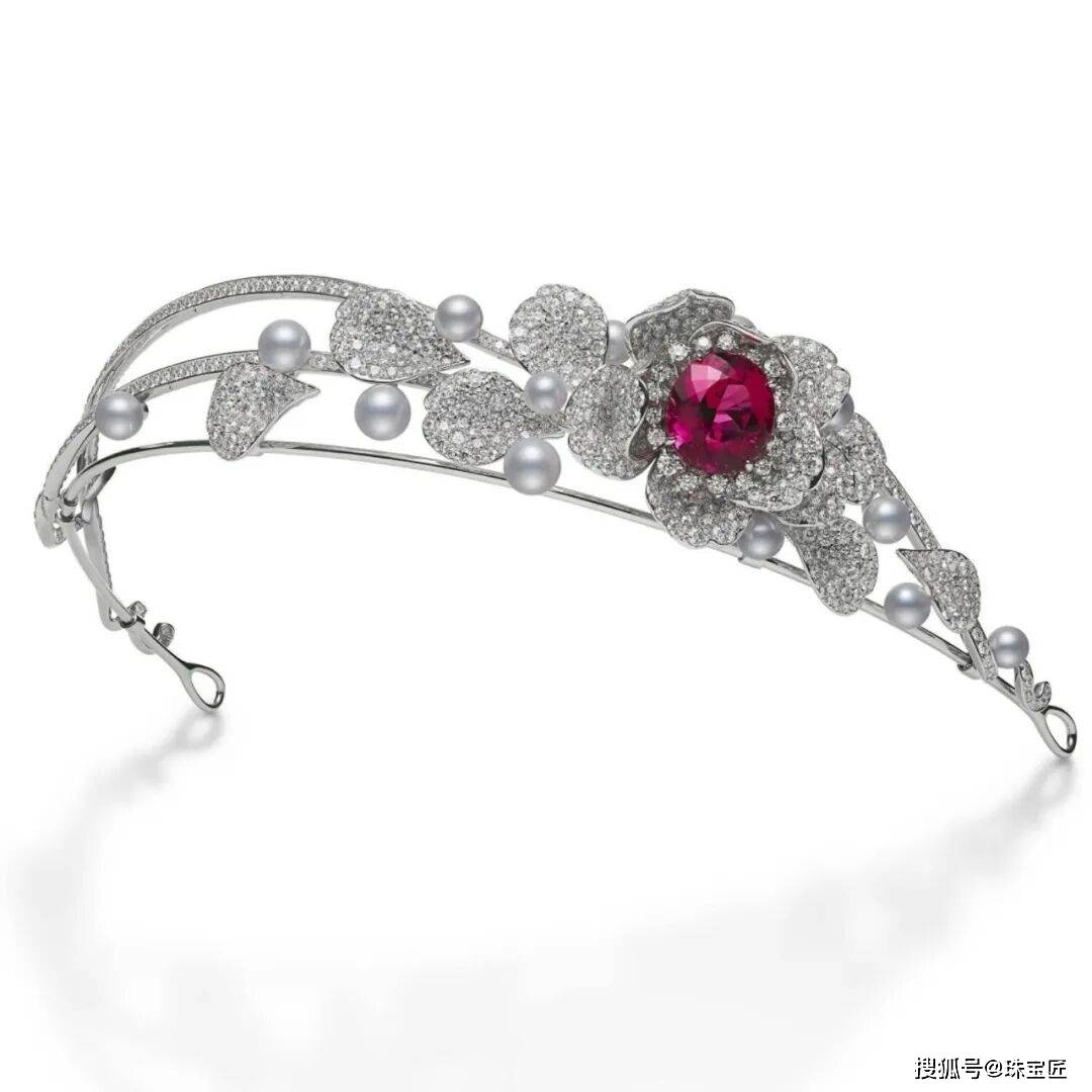 一朵红碧玺玫瑰钻石花点缀在一侧,本意是融合经典玫瑰意象与现代冠冕形式,但最终呈现的效果却介于传统老派与当代时尚之间,给人一种土不土、时尚不时尚的感觉~