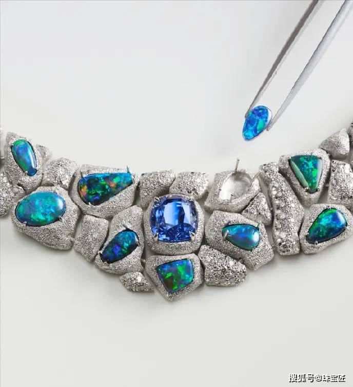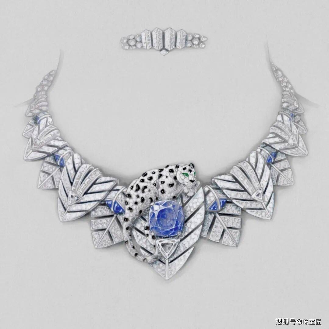 璀璨的钻石与缟玛瑙镶嵌而成的树叶,一只由钻石和缟玛瑙勾勒的猎豹,静静地趴伏其中,身下是一枚重达26.53克拉的斯里兰卡枕形切割蓝宝石。