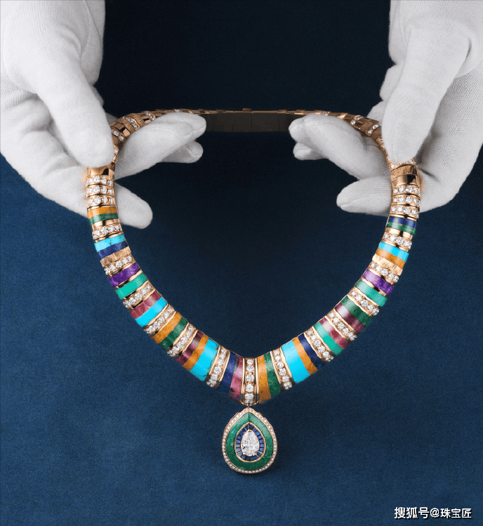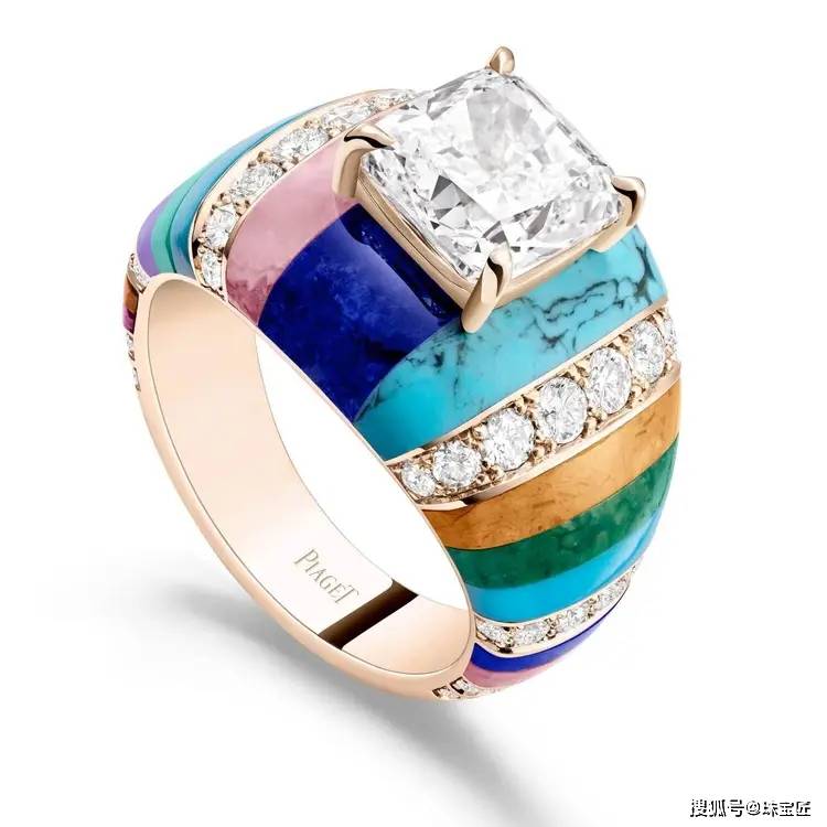 采用弧面定制切割的绿松石、菱锰矿、舒俱来等彩宝,演绎出标志性的欧普艺术风格。