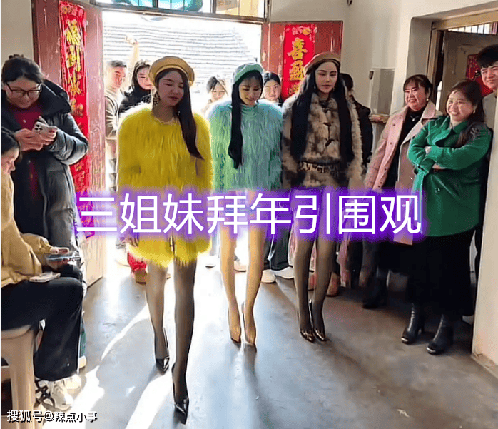 据说这三姐妹是家里最小的三个,前面还有三个,只是都已经结婚,老四的『打扮』是穿着一身暗色的保温,老五穿着一身蓝色的套装,蓝色的帽子,老六穿着一身黄色的皮草,连帽子都是黄色的!