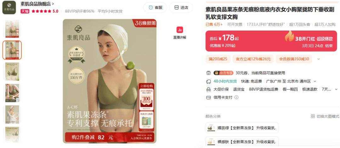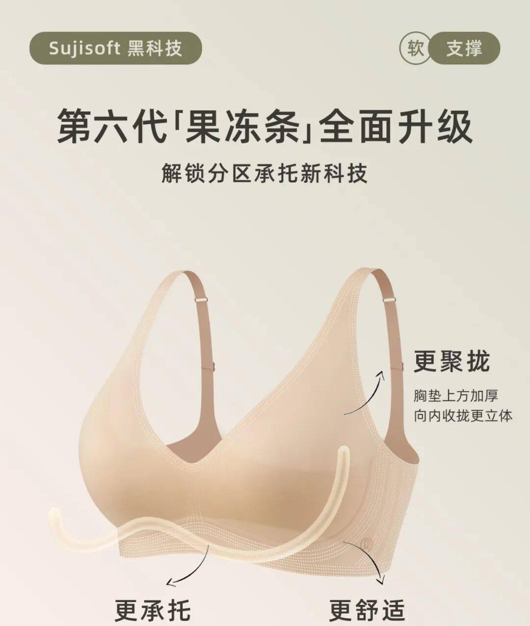 很多姐妹可能之前不了解素肌良品这个品牌,但如果提到内衣里的【 无感 软支撑】,它算得上是“开山鼻祖”了—— 靠 2018年 首创果冻条软支撑专利科技 ,填补了传统钢圈内衣太勒、无钢圈内衣太垮的市场空白。