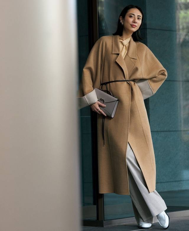 羊毛羊绒裹身大衣,通过在侧边开深衩的设计,行走时空气灌入,衣摆轻盈摇曳。