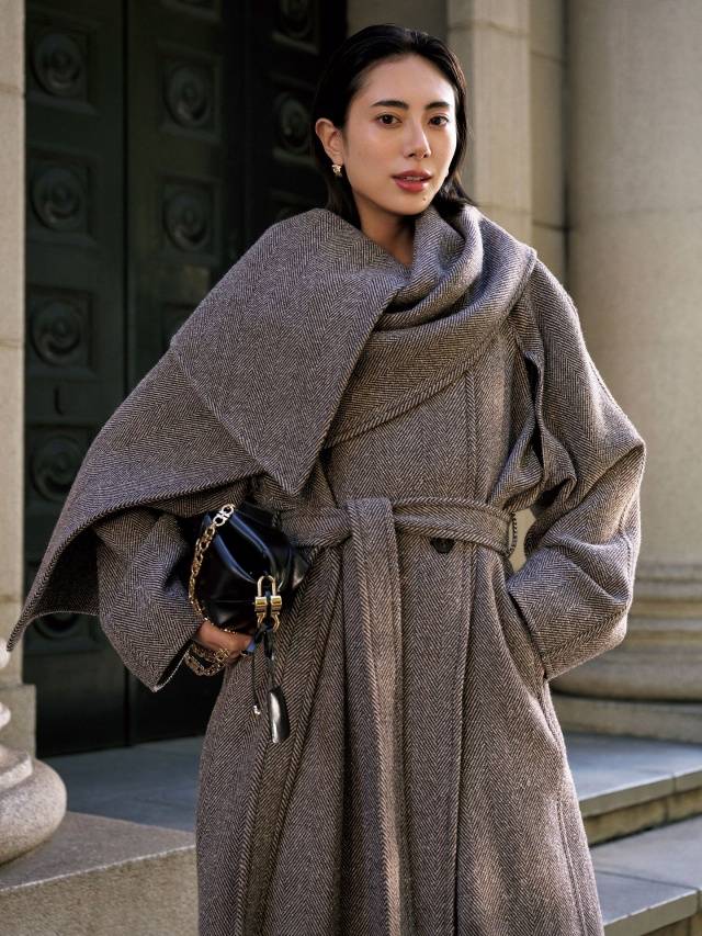 这款裹身大衣如同裹着大号围巾🧣般拥有丰富的层次感,单件即可享受,尽显戏剧化气质。不对称设计是其魅力所在,通过不同的“系法”,既能强调垂坠感,也能打造出高领效果,变化多端。