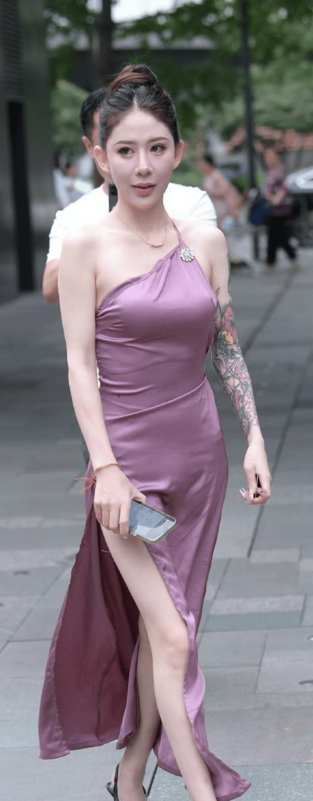 行走在街头,这样的造型无疑是一道靓丽的风景。不刻意追求浮夸的设计,仅靠简约的剪裁和恰到好处的细节,就将女性♀️的柔美与气场展现得淋漓尽致。这便是『穿搭』的魅力,用一件合适的衣物,放大自身的优势,诠释出独属于自己的时尚态度,既温柔了岁月,又惊艳了时光,让人过目难忘。粉紫色的缎面材质在光线的映衬下,泛着细腻的光泽,随着步伐的移动,光泽也随之流转,仿佛流动的紫色绸缎,既神秘又温婉。单肩带的设计打破了传统连衣裙👗的对称感,让整体造型更具设计感,同时也巧妙地修饰了肩颈线条,让颈部看起来更加修长。肩带处的钻饰在不经意间闪烁,为整体造型增添了一丝华丽感,却又不会显得过于张扬。