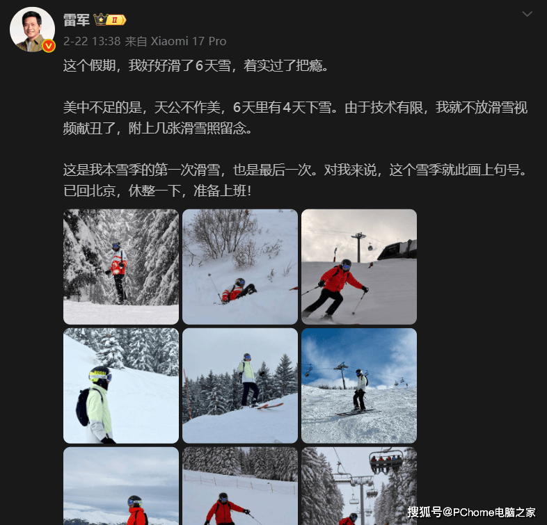 2026年2月24日消息,近日,雷军晒出滑雪🎿照后,网友迅速识别其滑雪🎿服为蕉内品牌同款,客服向媒体证实款式属实。