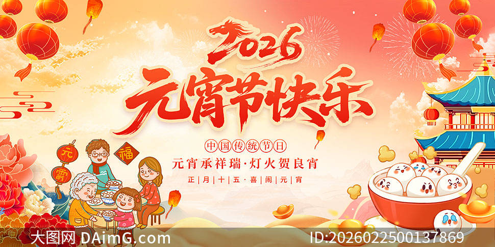 展板下方,是一家人围坐在一起吃汤圆的温馨画面,脸上洋溢着幸福的笑容,体现了元宵节团圆的主题。旁边还配有简洁的文字介绍,介绍元宵节的由来和传统习俗,让大家在欣赏展板的同时,也能深入了解这一传统节日的文化内涵。这组展板,将带您提前感受 2026 年元宵节的欢乐与温馨。