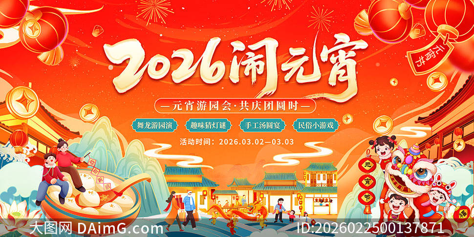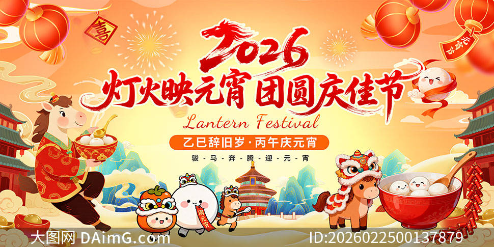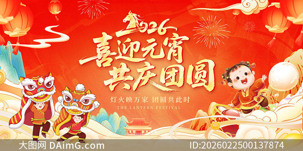 展板中间,用艺术字体书写着“2026 元宵佳节,共庆团圆”的主题,醒目又大气。周围环绕着舞龙舞狮的热闹场景,舞者们身姿矫健,龙狮栩栩如生,传递出蓬勃的生机与活力。