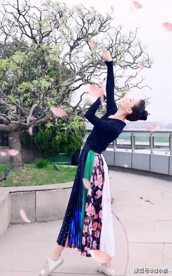 下身搭配的半身裙设计感特别强,堪称点睛之笔,深蓝色的裙身渐变至湖蓝,点缀着细碎的白色波点,侧边拼接了墨绿与粉白花卉图案,百褶的裙摆随着她的舞步轻轻摆动,既有民族风的灵动,又不失高级感,长度过膝不过踝,将得体和遮肉拿捏的刚刚好。