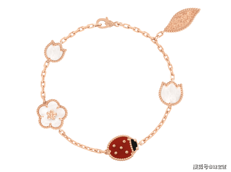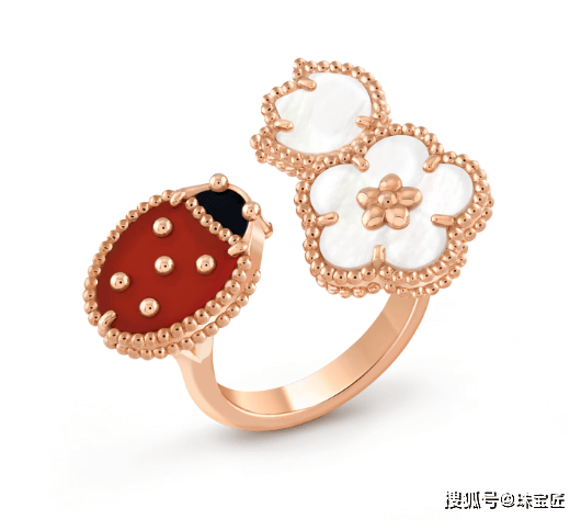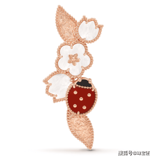 系列作品以18K玫瑰金打造花枝,白色珍珠母贝雕琢梅花花瓣,质地温润,光泽柔和,红玉髓点缀瓢虫,色彩对比鲜明,生动还原梅花绽放的姿态,营造出温柔生动的春日风光。