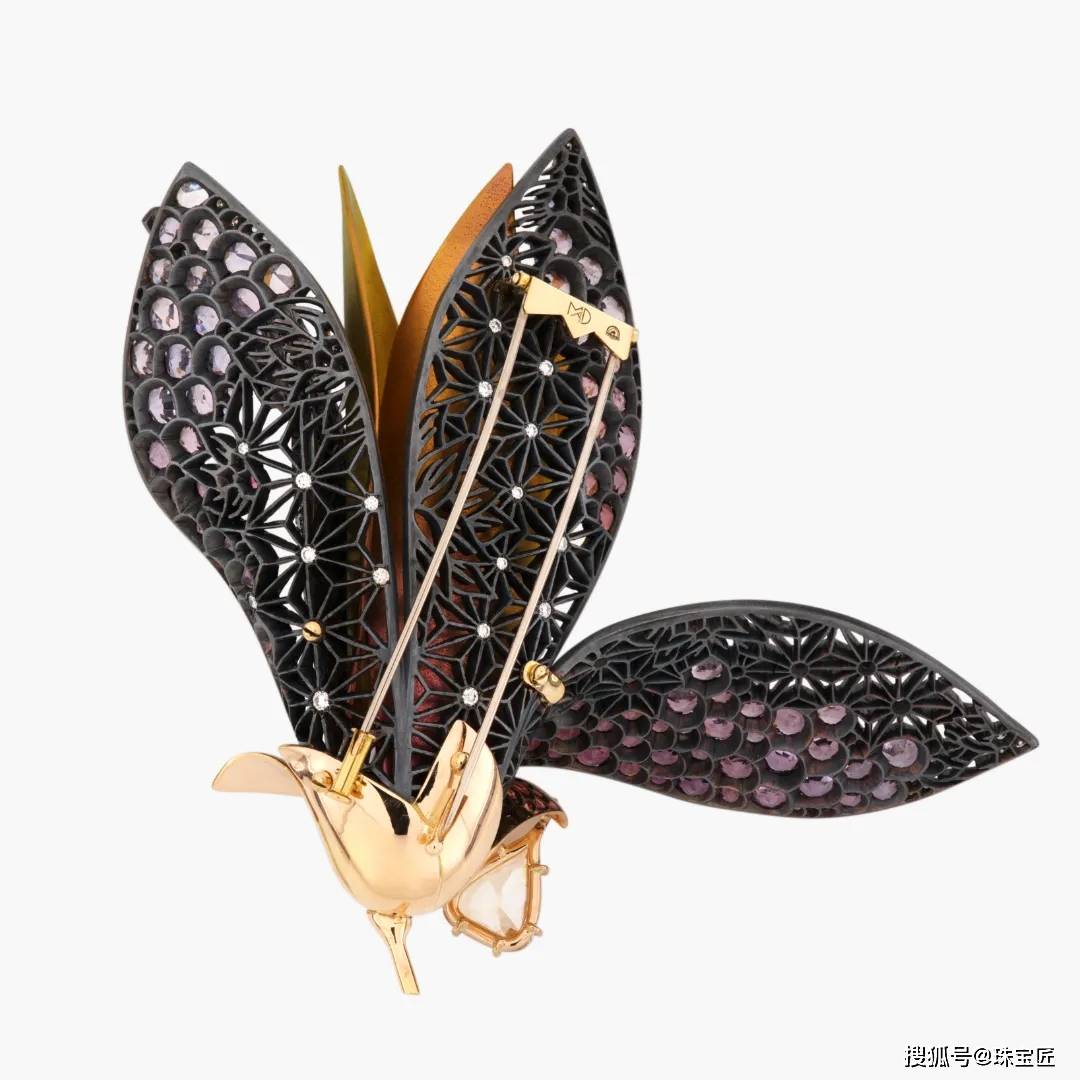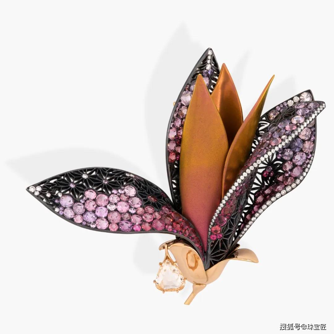 整件作品塑造出7枚立体的花瓣,中央3片用金色钛金属打造,带着温润的金属光泽;外围4片则是镀黑银镂空造型,上面密密铺满了渐变的粉紫色尖晶石,从浅粉过渡到紫红,像晨露未干的玉兰花瓣。