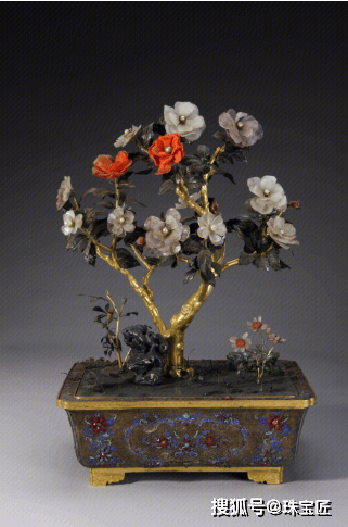 例如故宫珍藏文物中,这件清中期的银累丝嵌玉石玻璃盆银叶玉石桃花盆景,以银累丝、玉石等珍贵材质精工打造,花枝怒放,尽显清雅之态;