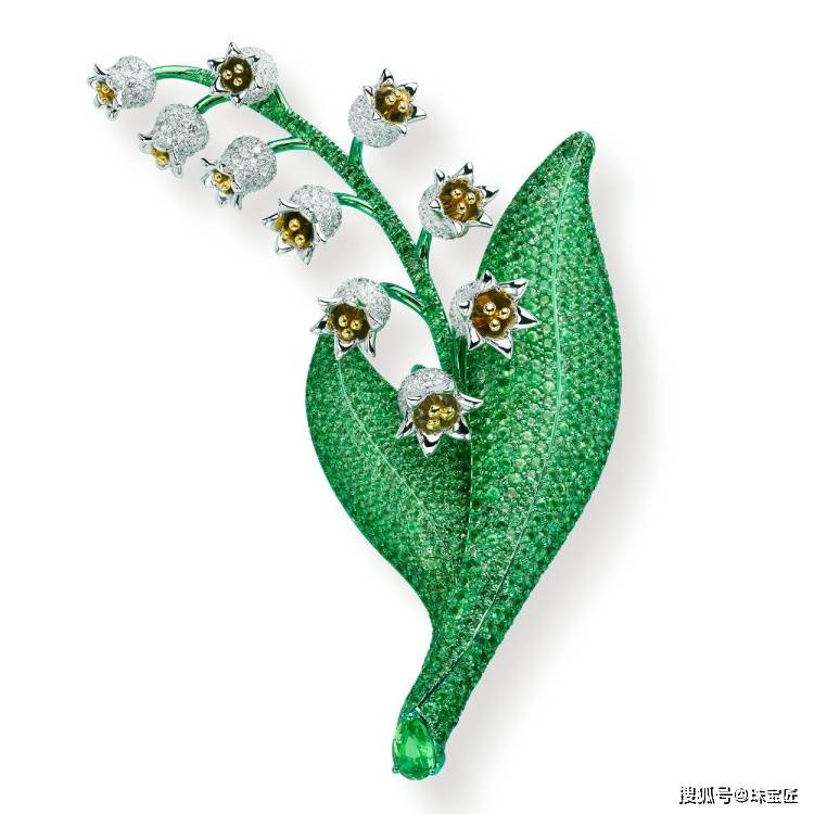 萧邦于2024年Red Carpet高级珠宝系列推出的铃兰胸针,则另辟蹊径,以钛金属打造叶片,经氧化工艺呈现独特电光绿色,密镶总重近4ct绿色沙弗莱石,叶脉纹理清晰流畅。