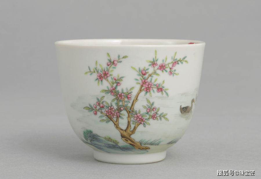而清道光官窑的粉彩游鸭桃花纹杯,则以釉上粉彩绘就仲春胜景,杯身桃花折枝舒展,水面游鸭悠然自得,通过细腻的分层渲染,完美定格了 “桃夭水暖” 的诗意瞬间。