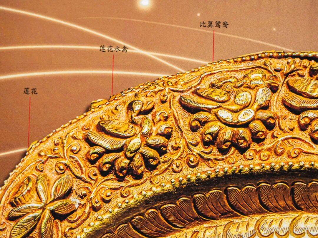 正中间是鸳鸯,莲花瓣……梳脊部分则以 缠枝卷草纹装饰,梳背下缘内折,设计为仰覆的莲瓣。