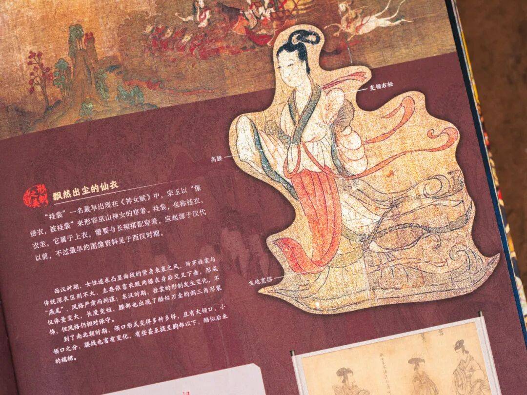 原来洛神一身盛装叫做“褂裳”,一大特点就是缀有长长的飘带,以及参差不齐的衣袂。