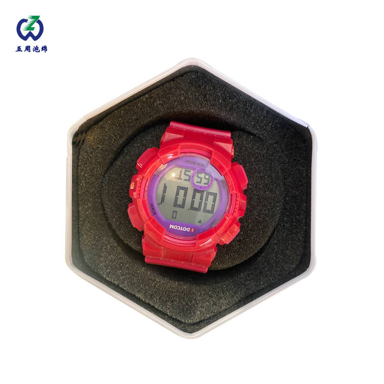 运动手表作为兼具工具属性与时尚属性的消费品,其包装面临着 “外观展示” 与 “防摔防护” 的双重挑战。图中这款六边形黑色海绵🧽内衬,是专为红色透明款运动手表设计的定制化防护载体,既解决了运输安全问题,又提升了产品的视觉档次。