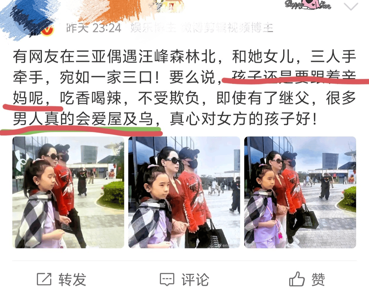 有意思的是,森林北的女儿和汪峰与『章子怡』所生的醒醒年龄相仿,将来两个孩子应该能玩到一块去。汪峰对这个新身份也挺上心,尽到了一个准继父的责任。即便亲生女儿不在身边,他对继女的照顾也毫不敷衍。