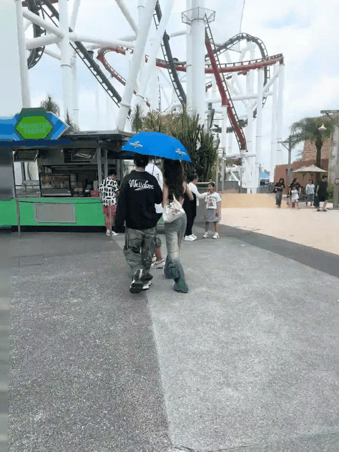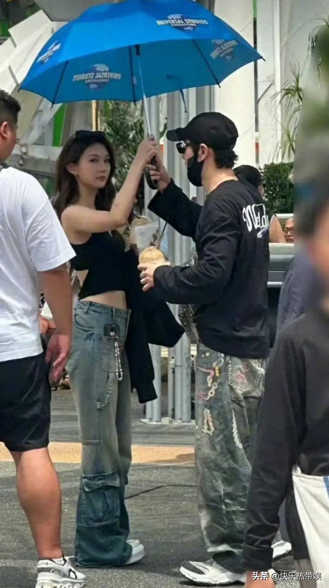 两人并肩走在街头,共同撑着一把伞,举止亲昵,仿佛无所不聊。令人注意的是,他们穿着同款的情侣『运动鞋』,甚至裤子的风格也是统一的,都是那种宽松的工装牛仔裤👖。『黄晓明』的眼神始终关注着女孩,举止间透露出一丝小心翼翼,似乎在格外小心她的感受,尽管周围有不少目光,他们依旧显得默契十足。