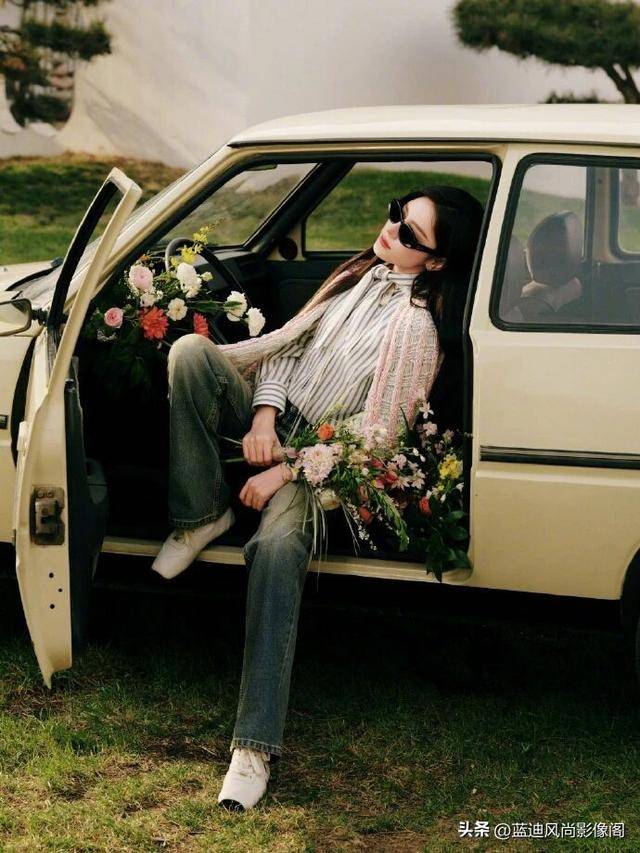 竖条纹的纵向线条,悄悄拉长身形,和宽松的开衫形成了 “外松内紧” 的视觉对冲,哪怕搭配休闲牛仔裤👖,也完全不会压个子,干净的白黑条纹,刚好中和了粉调开衫的柔媚,让整套造型甜而不腻,柔而不软。下装的浅灰色水洗牛仔裤👖,更是把「松弛感与精致感的平衡」玩明白了。蓝迪一直说,高奢搭配的最高级,是用休闲单品中和正装的刻板,用精致单品撑起休闲款的质感。这条牛仔裤👖选的是高克重垂坠面料,不软塌、不起皱,微宽松的直筒裤型完美修饰腿型,适配长途飞行的舒适需求,同时和上装柔媚的开衫、利落的衬衫形成了绝妙的风格对冲 —— 上装是 DIOR 的法式优雅,下装是日常的随性松弛,一雅一闲之间,把明艳大『明星』️的气场,和邻家少女的亲切感平衡得刚刚好,不会太正式像赶秀场,也不会太随意丢了品牌大使的身份,这才是『时装周』出发图的正确打开方式。