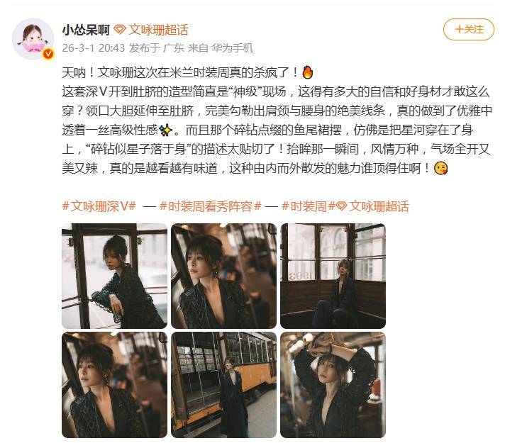 3月1日,文咏珊在米兰『时装周』的一记“深V暴击”,直接让全网不淡定了。一袭领口开到肚脐的黑色礼服,搭配看似乖巧的减龄刘海,不仅瞬间引爆话题,更被网友封为“妹感姐”天花板——少女的灵动与女王的霸气,在她身上来了个完美对撞。