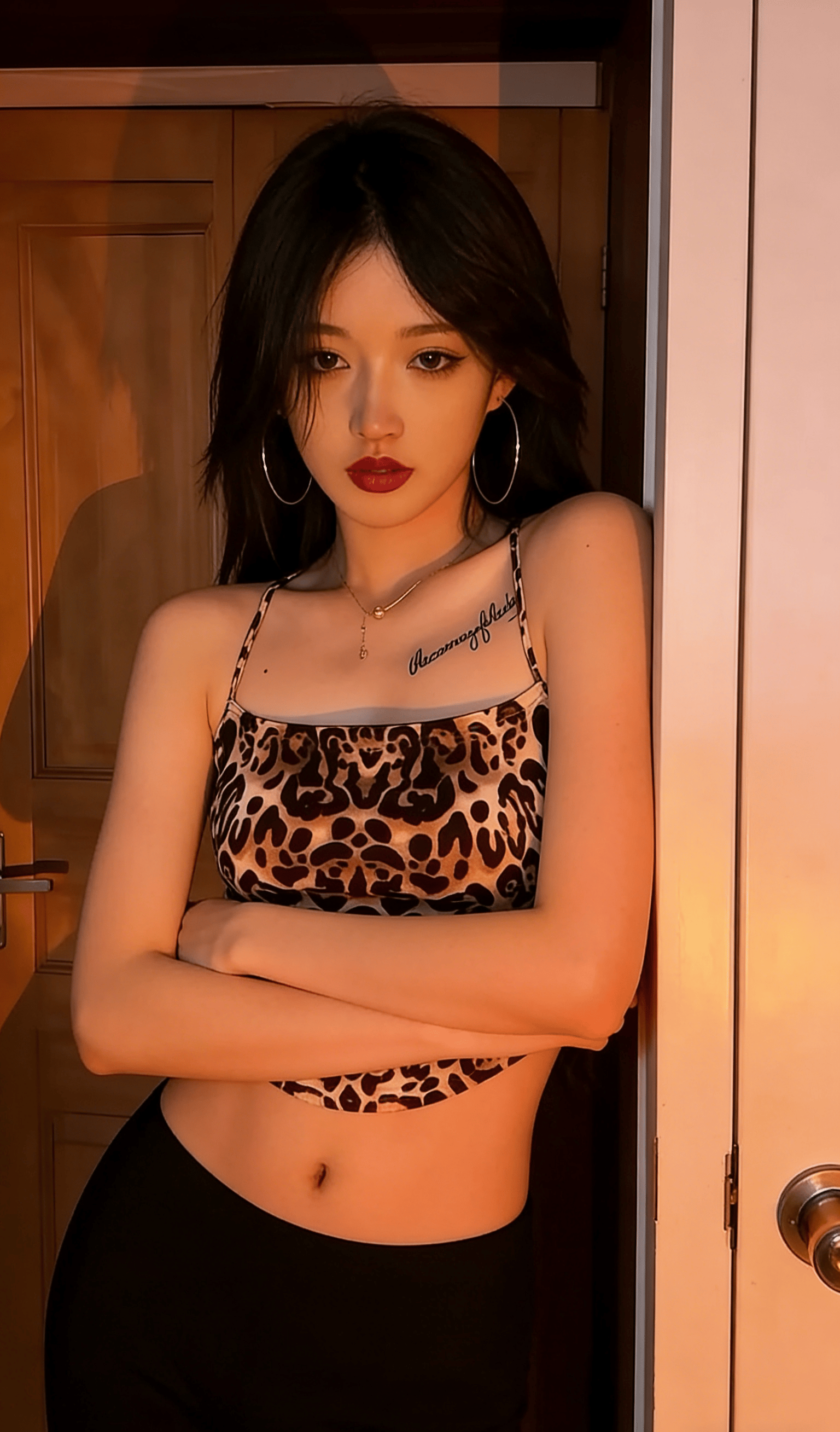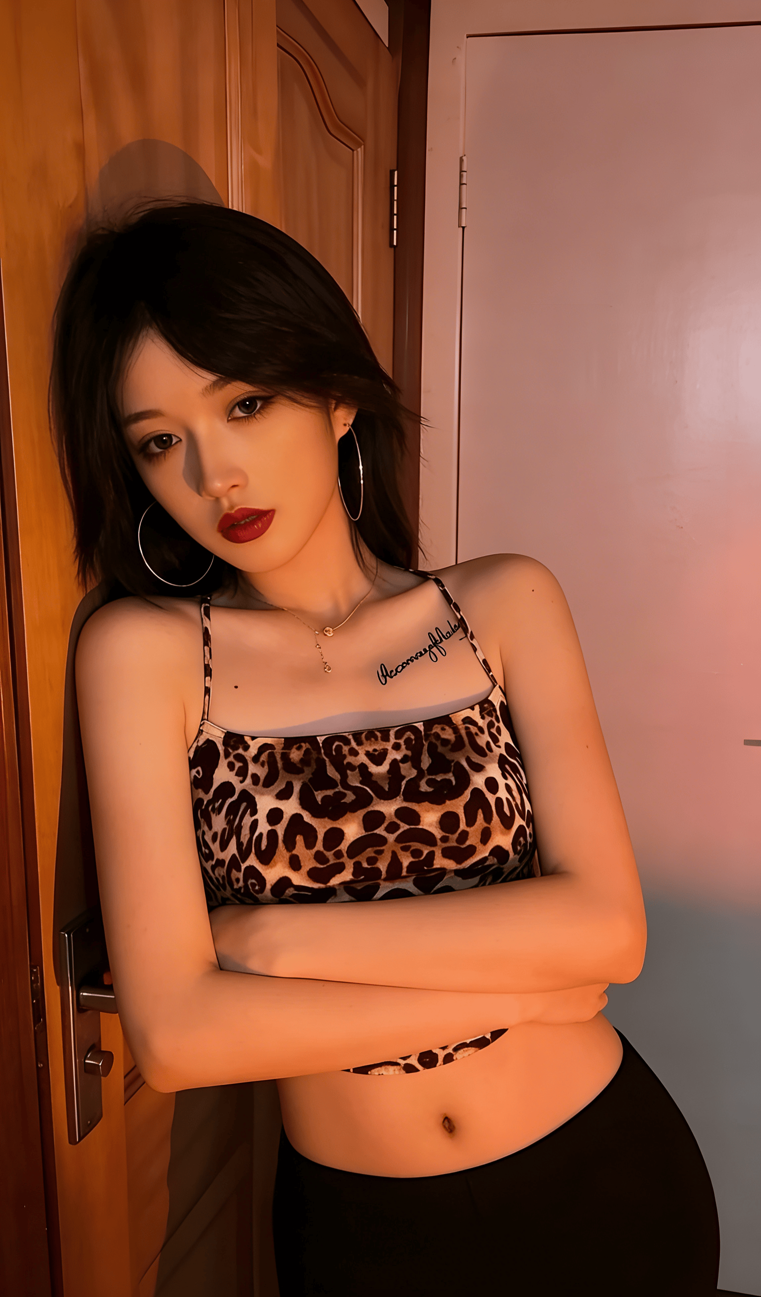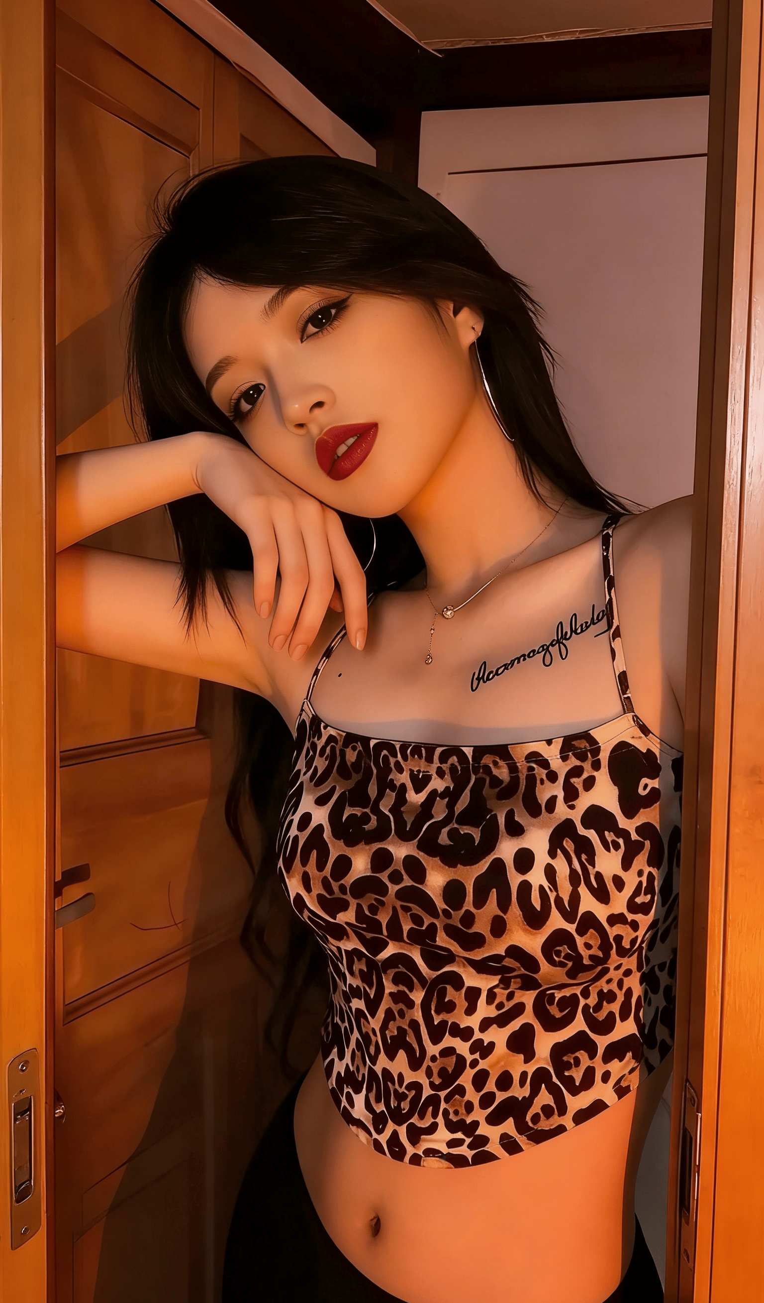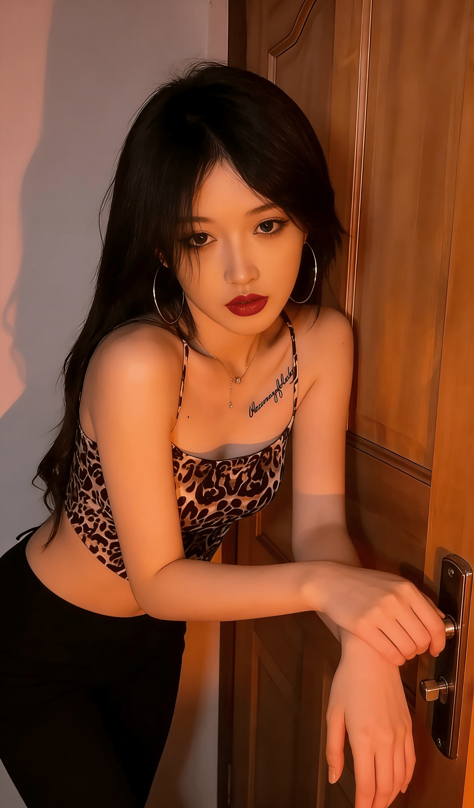 她就那样懒懒地斜倚在木质门框上,指尖轻轻划过温润的木纹,连呼吸都带着松弛慵懒的调子。大圈银环随着她微微偏头的动作轻轻晃荡,锁骨处的纹身成了最勾人的小点缀,眼波流转间,像是藏了无数句软乎乎的悄悄话,只等着凑到你耳边,用气声慢慢说。没有多余的刻意动作,没有半分讨好的姿态,只是一个抬眼,一个浅笑,就让周遭的空气都悄悄缠上了暧昧的因子。