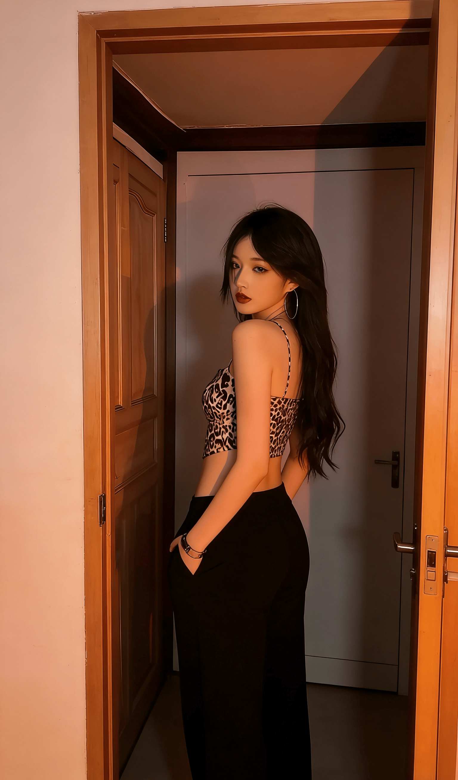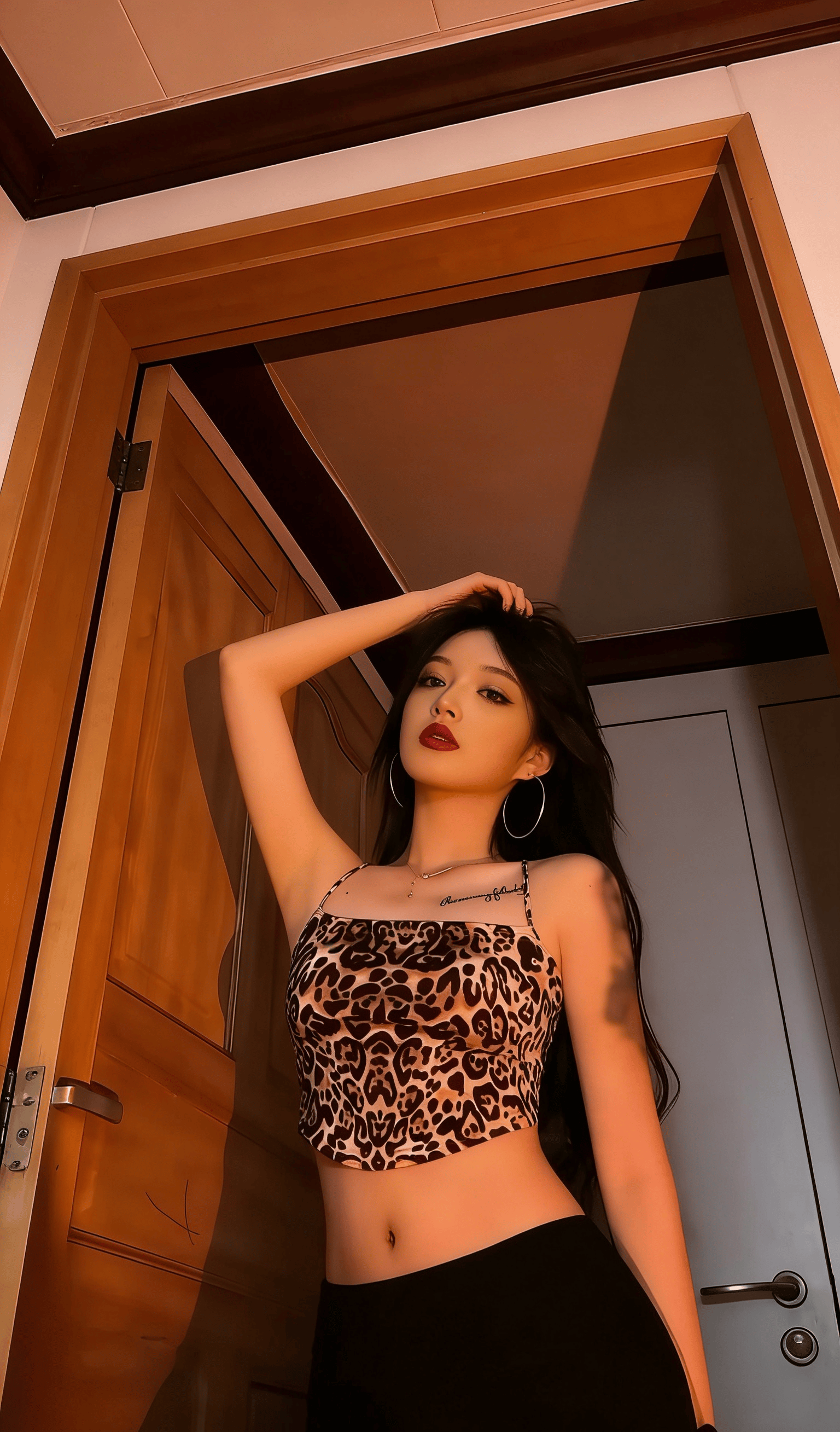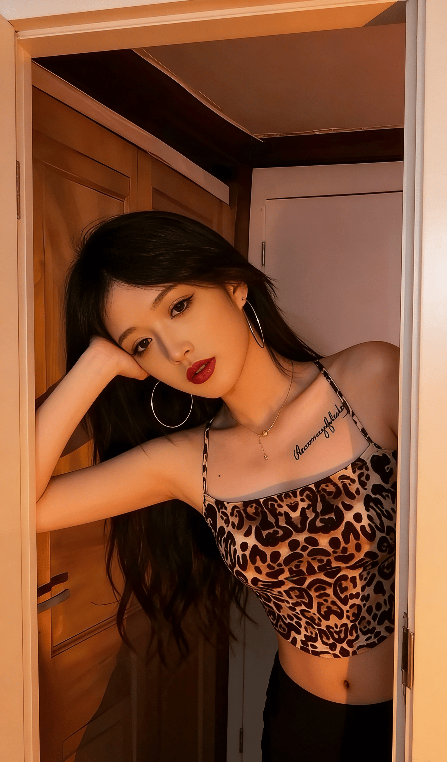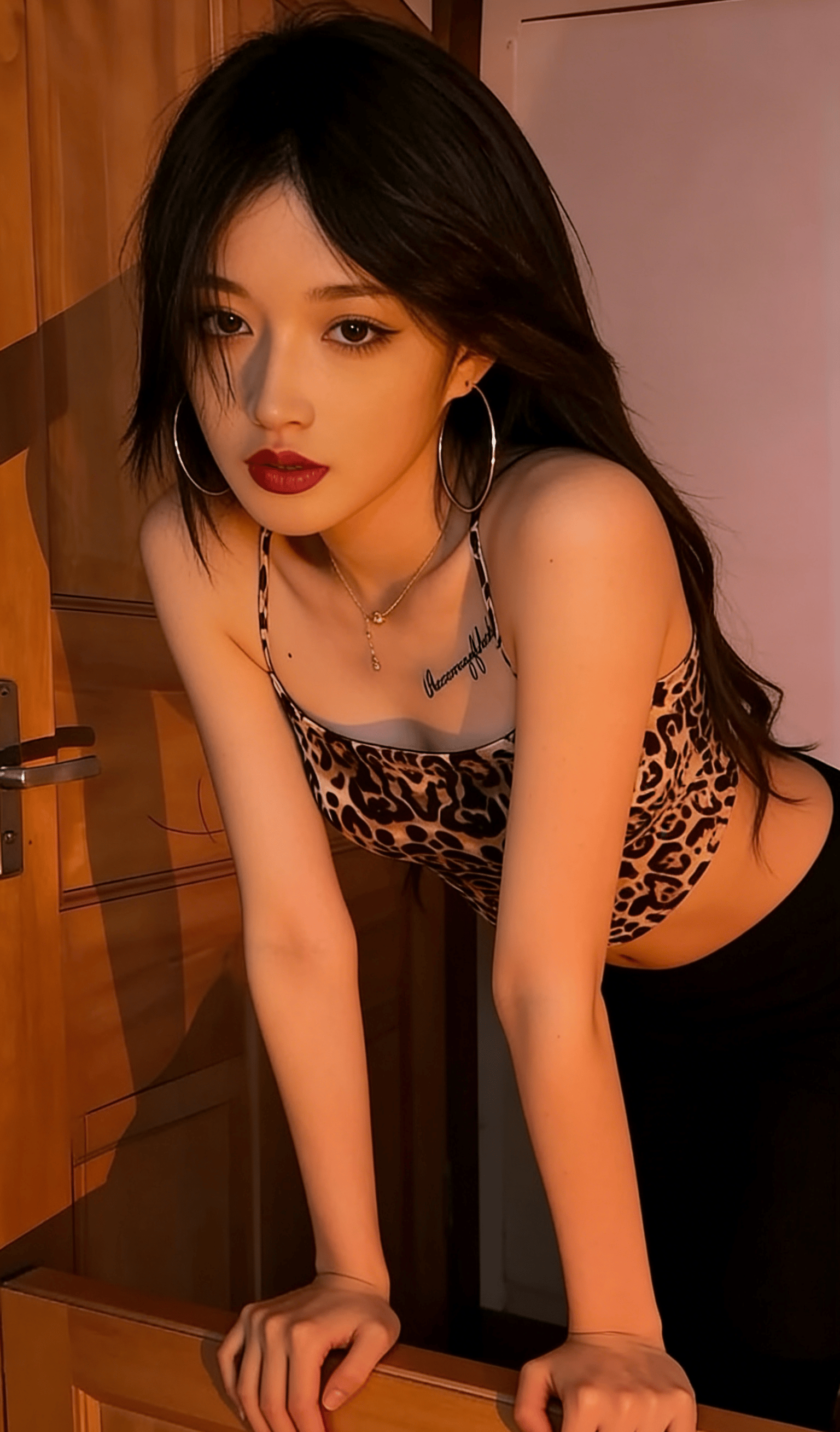 她就那样懒懒地斜倚在木质门框上,指尖轻轻划过温润的木纹,连呼吸都带着松弛慵懒的调子。大圈银环随着她微微偏头的动作轻轻晃荡,锁骨处的纹身成了最勾人的小点缀,眼波流转间,像是藏了无数句软乎乎的悄悄话,只等着凑到你耳边,用气声慢慢说。没有多余的刻意动作,没有半分讨好的姿态,只是一个抬眼,一个浅笑,就让周遭的空气都悄悄缠上了暧昧的因子。