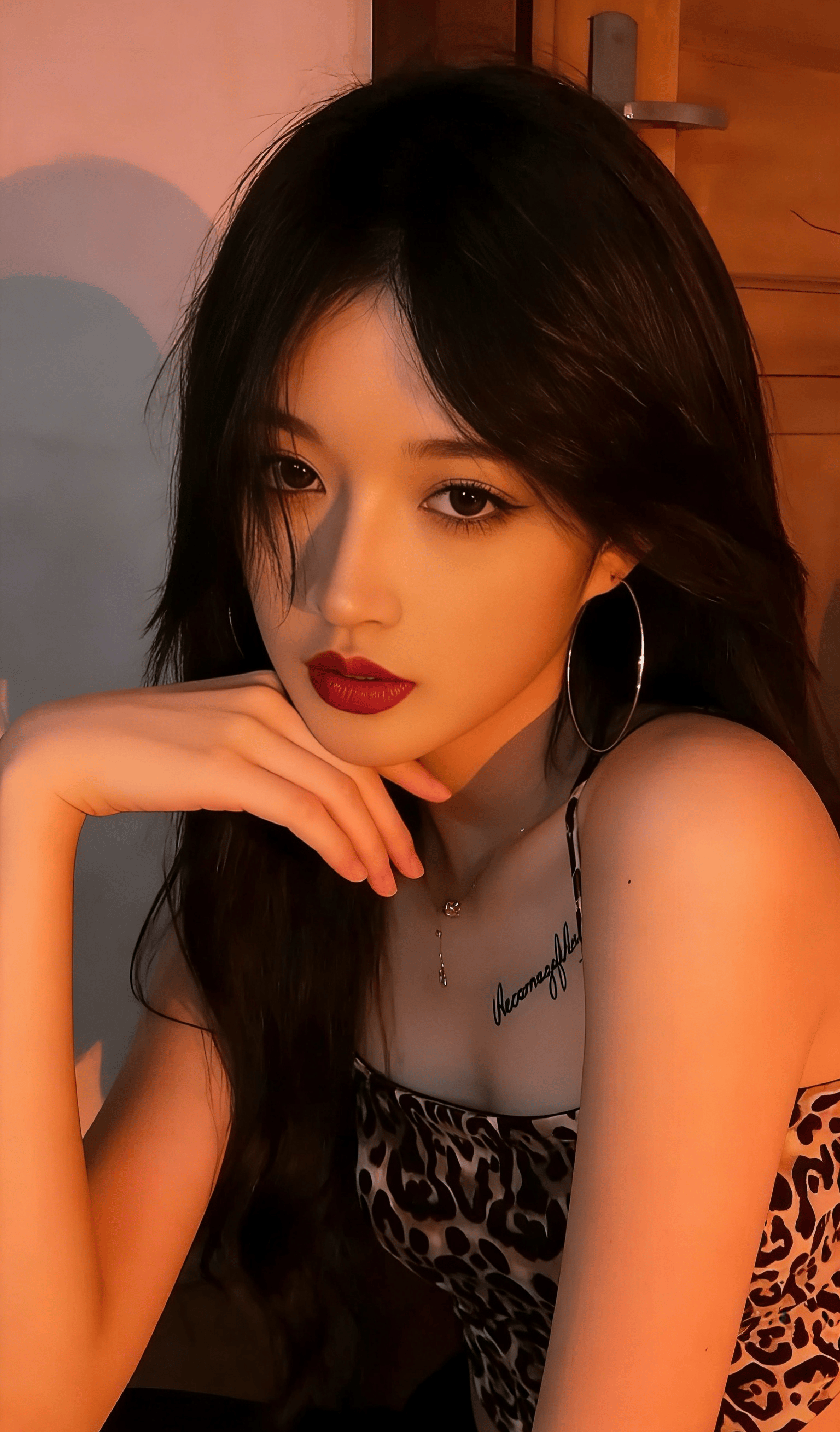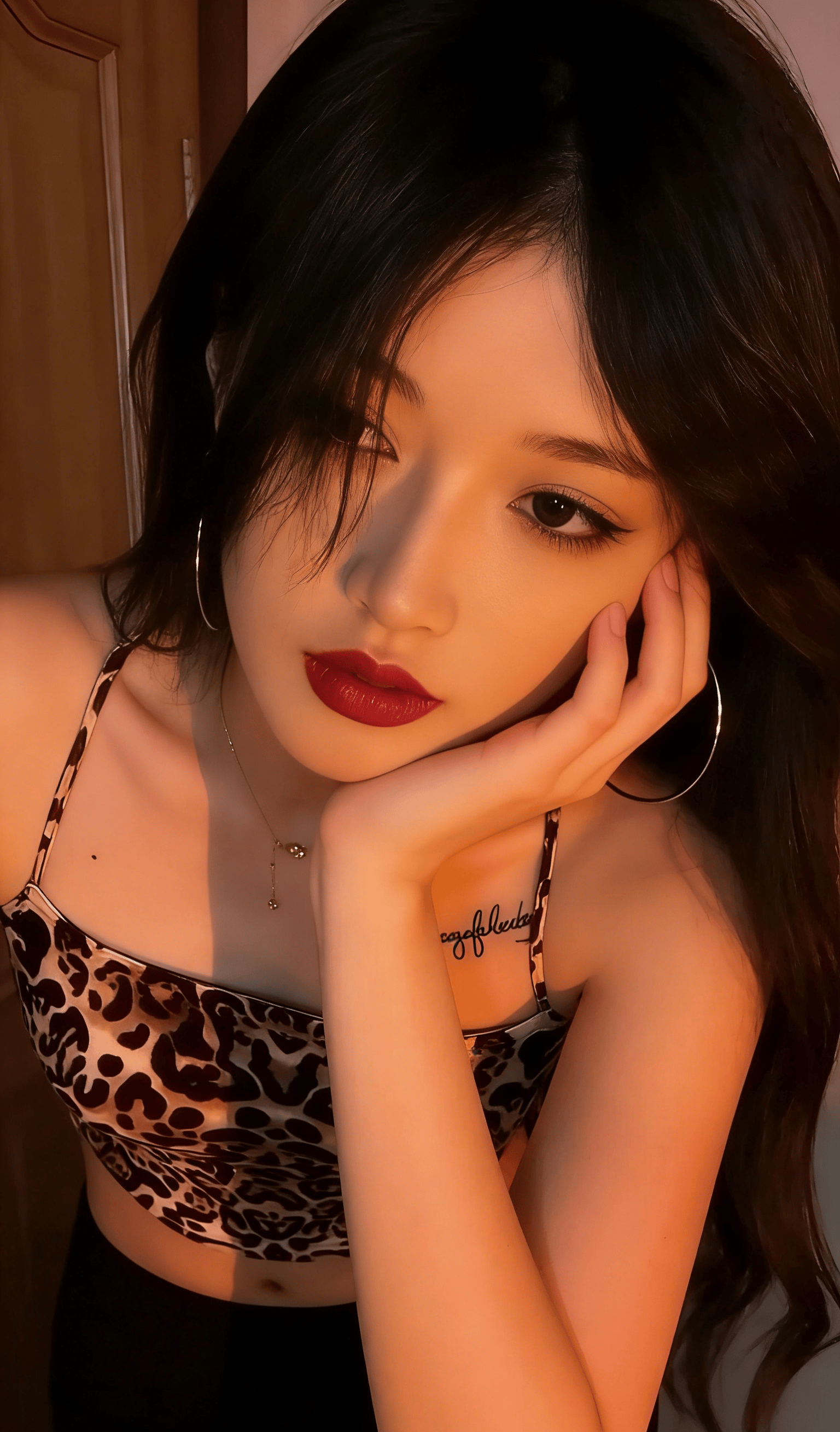 推开门的瞬间,暖融融的橘调灯光先一步裹了过来,撞进眼底的,是她带着漫不经心笑意的眉眼。红唇似火,晕开恰到好处的明艳,乌黑的『长发』如瀑般垂落肩头,野性的豹纹吊带紧紧裹着玲珑惹眼的曲线,露出来的腰肢纤细得恰到好处,却偏偏配了一双温柔得能淌出水的杏眼。冷感的野性与软意的温柔撞个满怀,直接酿成了最致命的吸引力。
