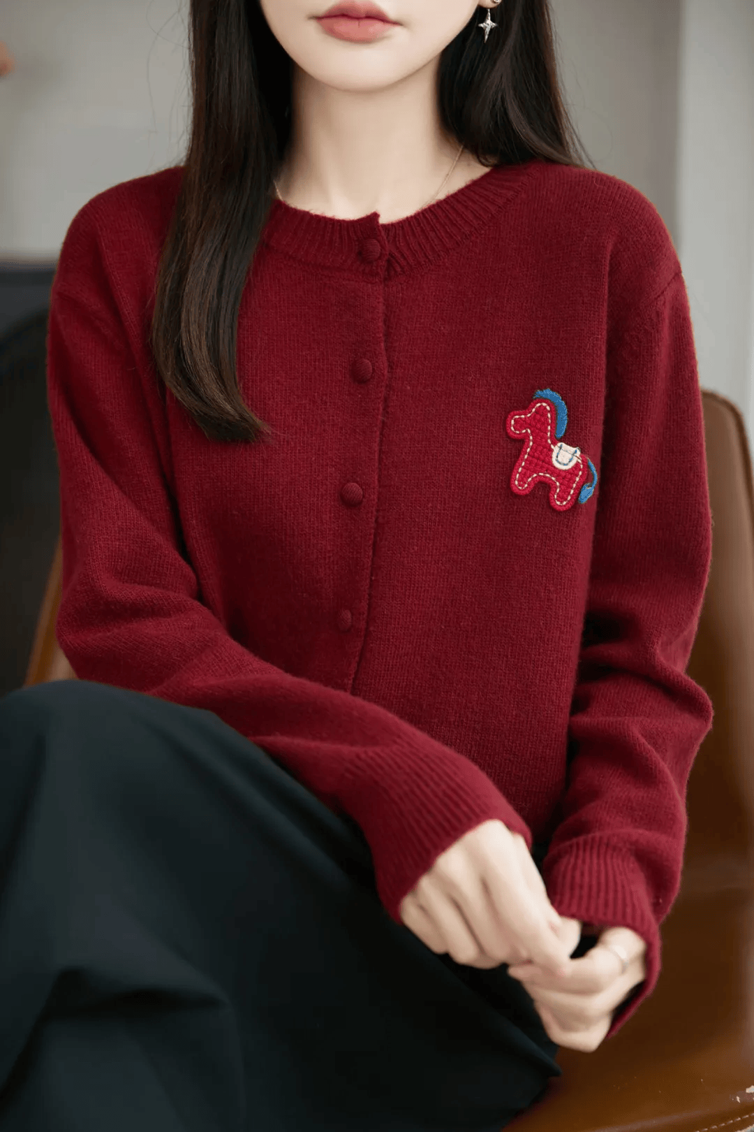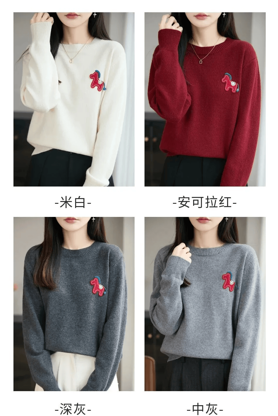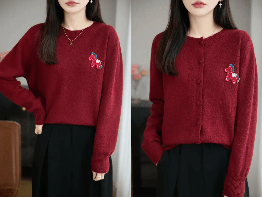 如果不喜欢花里胡哨、容易过时的马年毛衣,那我强烈推荐大家买这款毛衣,分圆领款、开衫款两种。如果你体型微胖,强烈建议你买开衫款,我自己就是拿的红色开衫款。春节团圆饭聚会穿它绝对能在人群中脱颖而出。胸前红色的立体织线小马,有很好的意头。