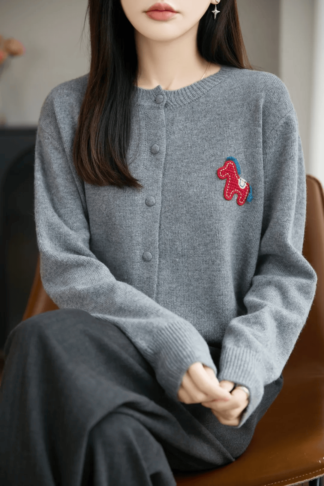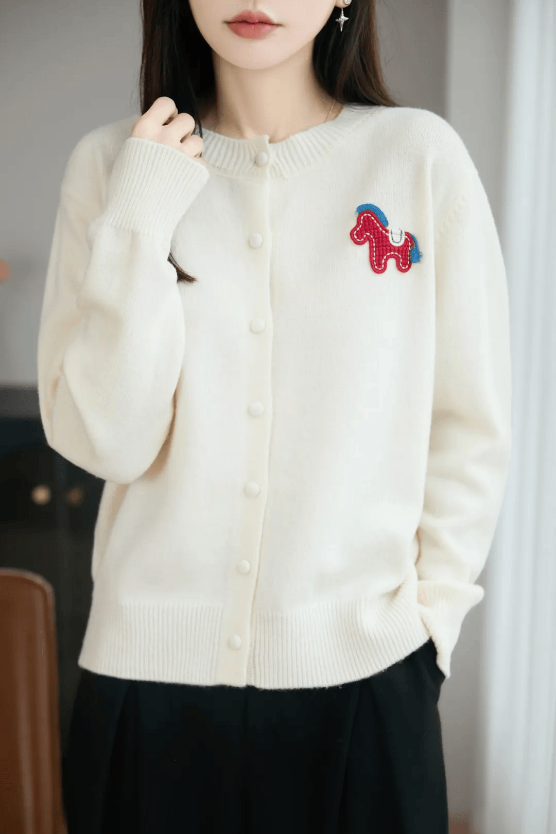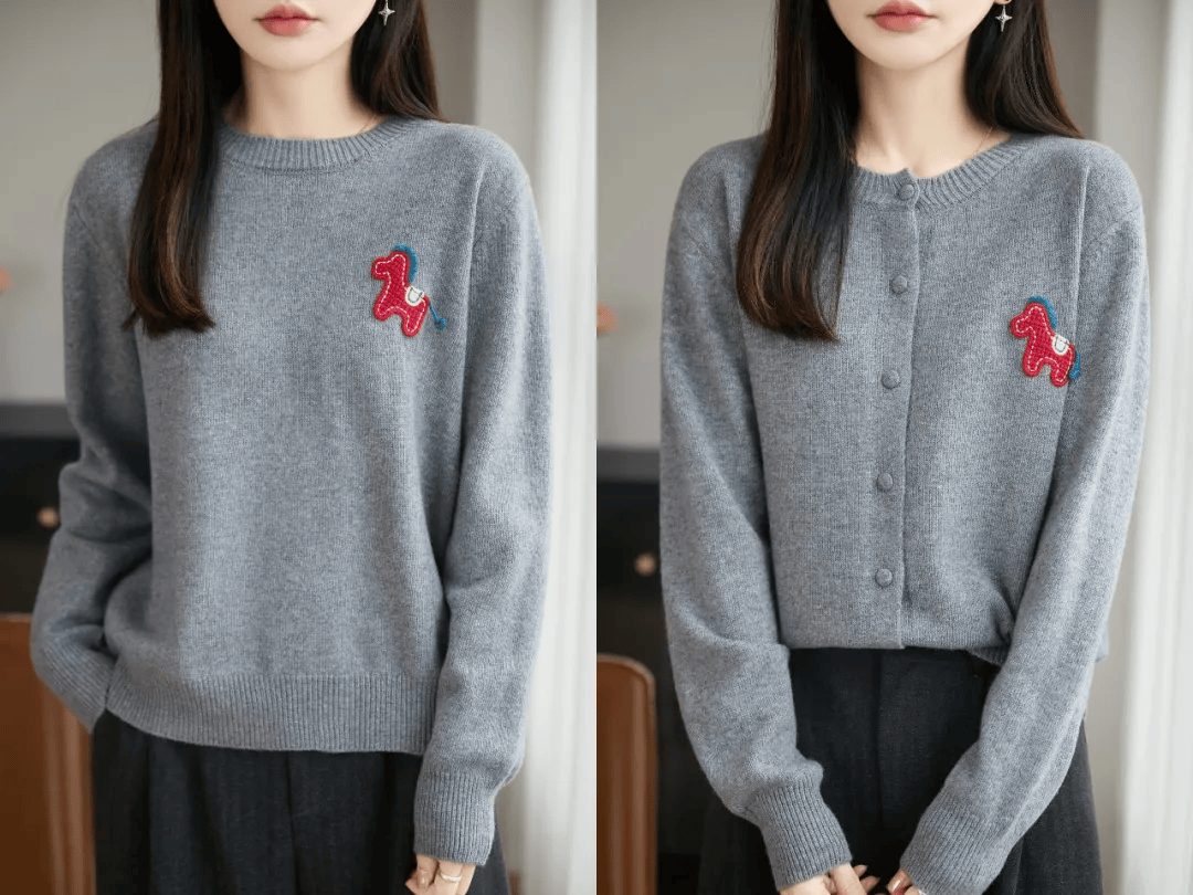 如果不喜欢花里胡哨、容易过时的马年毛衣,那我强烈推荐大家买这款毛衣,分圆领款、开衫款两种。如果你体型微胖,强烈建议你买开衫款,我自己就是拿的红色开衫款。春节团圆饭聚会穿它绝对能在人群中脱颖而出。胸前红色的立体织线小马,有很好的意头。