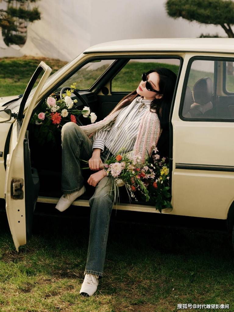 最绝的是氛围感:她倚在复古车旁提着印花『托特包』,或者慵懒坐在车里被鲜花环绕,每一张图都像电影画报,打破了时尚大片那种冷冰冰的距离感,让人觉得 “原来时尚也可以这么贴近生活”。