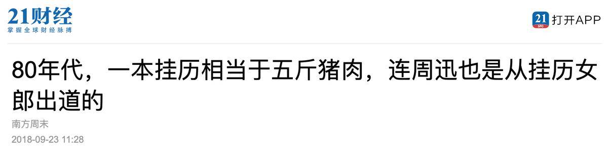 信息来源:南方周末,2018-09-24,世纪80年代,一本挂历相当于五斤猪肉,连『周迅』也是从挂历女郎出道的