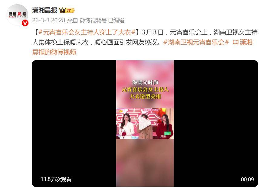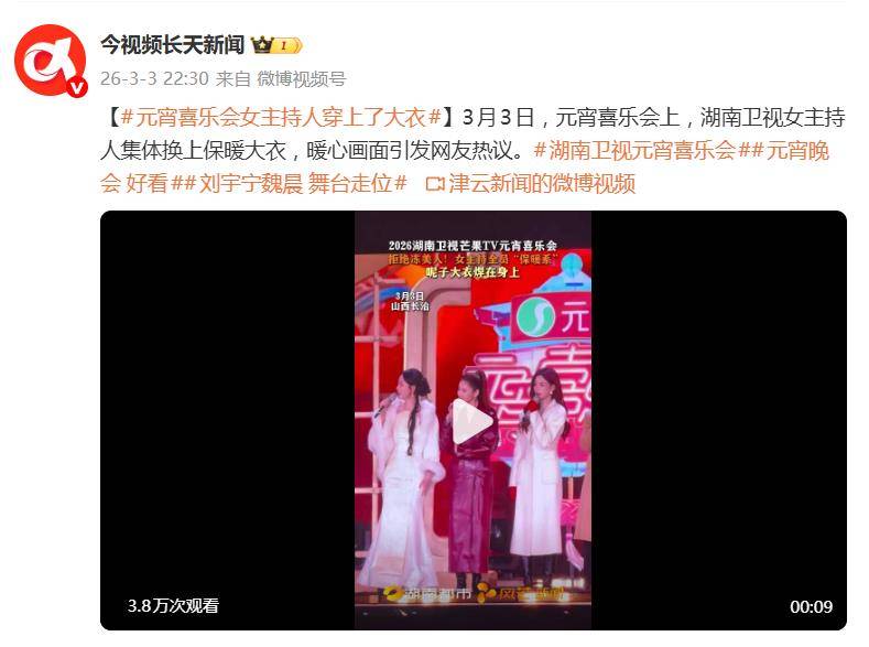3月3日晚间的湖南卫视元宵喜乐会上,一场“着装革命”悄然上演:女主持人集体脱下单薄礼服,换上保暖呢子大衣亮相。这波操作瞬间引爆网络,收获“暖和又美丽才是真仪式感”的刷屏式好评,也让“告别冻美人”成了开年最暖话题。