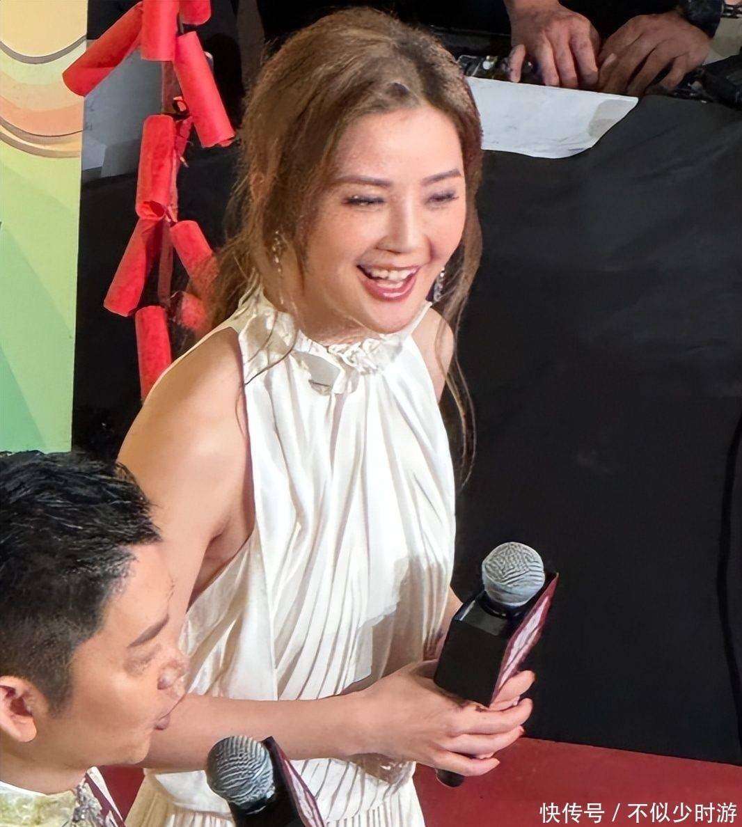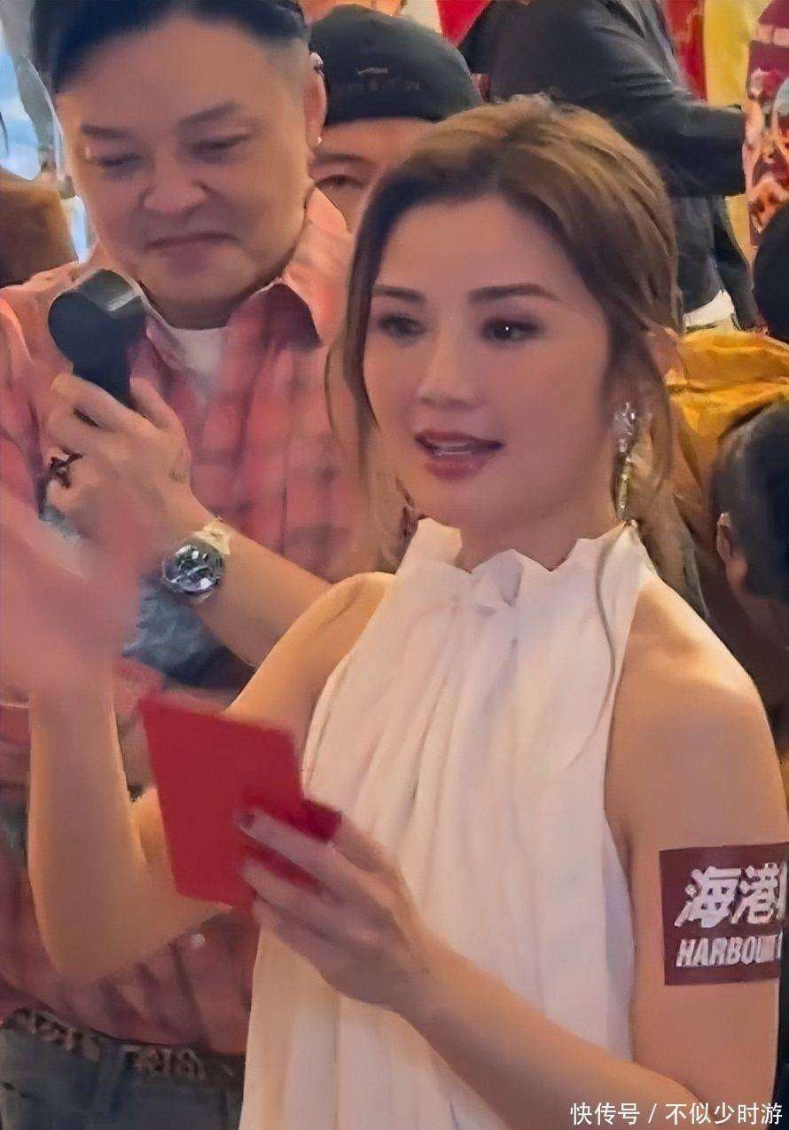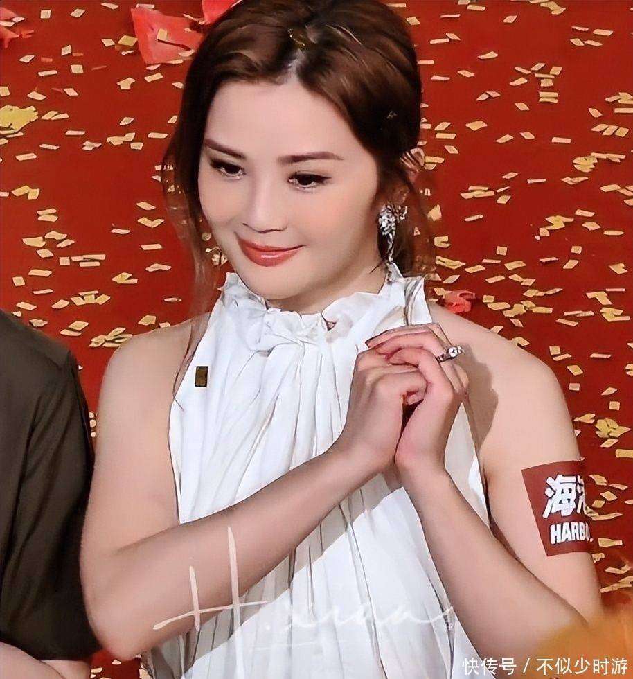 阿Sa的『穿搭』也引人注目,她身着一件纯白无袖挂脖式上衣,搭配同色系的垂感半裙,整体造型意在展现一种清新脱俗的冬日新中式美学。然而,实际效果却有些许违和感,双臂的线条比以前更加紧实,与她早年纤细伶俐的身形有了明显对比。站在金龙浮雕前,她的肩背线条显得更为开阔,视觉上也带有了一些敦厚感,仿佛昔日的玲珑身形已经沉淀出一种更为沉稳的气质。与醒狮合影时,她的神情略显放松,面部轮廓和下颌线的过渡变得柔和,肌肤也透出一种光泽感,似乎有些细腻的调整过的痕迹,完全没有昔日港风美人那种精致的骨相和明媚的笑容。